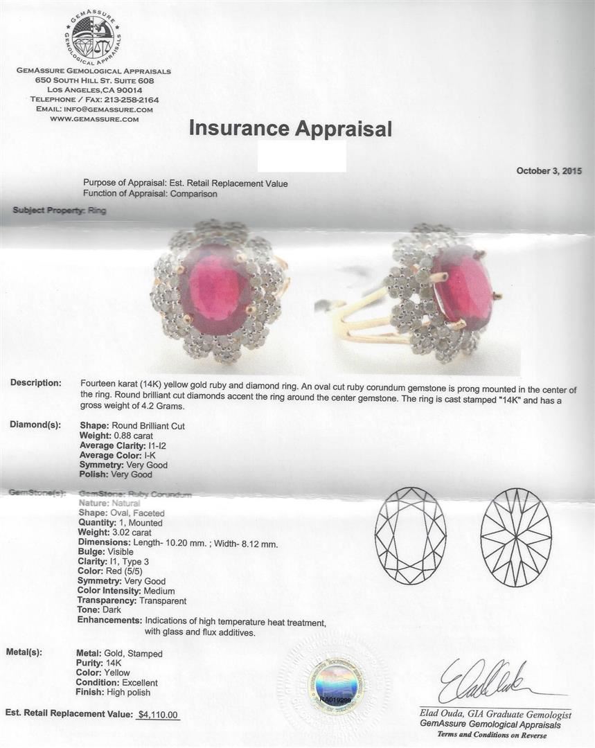 Fourteen karat (14K) yellow gold ruby and diamond ring. An oval cut ruby corundum gemstone is prong mounted in the center of the ring. Round brilliant cut diamonds accent the ring around the center gemstone and on both sides. The ring is cast stamped "14K" and has a gross weight of 4.2 Grams. Diamond(s): Shape: Round Brilliant Cut. Weight: 0.88 carat. Average Clarity: I1-I2. Average Color: I-K. Symmetry: Very Good. Polish: Very Good. Gemstone(s): GemStone: Ruby Corundum. Nature: Natural. Shape: Oval, Faceted. Quantity: 1, Mounted. Weight 3.02 carat. Dimensions: Length-10.20 mm. ; Width- 8.12 mm. Bulge: Visible. Clarity: I1, Type 3. Color: Red (5/5). Symmetry: Very Good. Color Intensity: Medium. Transparency: Transparent. Tone: Dark. Enhancements: Indications of high temperature heat treatment, with glass and flux additives. Metal(s): Metal: Gold, Stamped. Purity: 14K. Color: Yellow. Condition: Excellent. Finish: High polish. GGA Appraised.