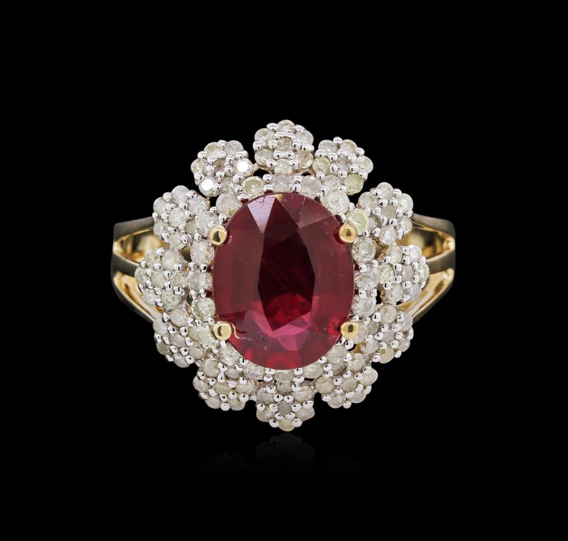 Fourteen karat (14K) yellow gold ruby and diamond ring. An oval cut ruby corundum gemstone is prong mounted in the center of the ring. Round brilliant cut diamonds accent the ring around the center gemstone and on both sides. The ring is cast stamped "14K" and has a gross weight of 4.2 Grams. Diamond(s): Shape: Round Brilliant Cut. Weight: 0.88 carat. Average Clarity: I1-I2. Average Color: I-K. Symmetry: Very Good. Polish: Very Good. Gemstone(s): GemStone: Ruby Corundum. Nature: Natural. Shape: Oval, Faceted. Quantity: 1, Mounted. Weight 3.02 carat. Dimensions: Length-10.20 mm. ; Width- 8.12 mm. Bulge: Visible. Clarity: I1, Type 3. Color: Red (5/5). Symmetry: Very Good. Color Intensity: Medium. Transparency: Transparent. Tone: Dark. Enhancements: Indications of high temperature heat treatment, with glass and flux additives. Metal(s): Metal: Gold, Stamped. Purity: 14K. Color: Yellow. Condition: Excellent. Finish: High polish. GGA Appraised.