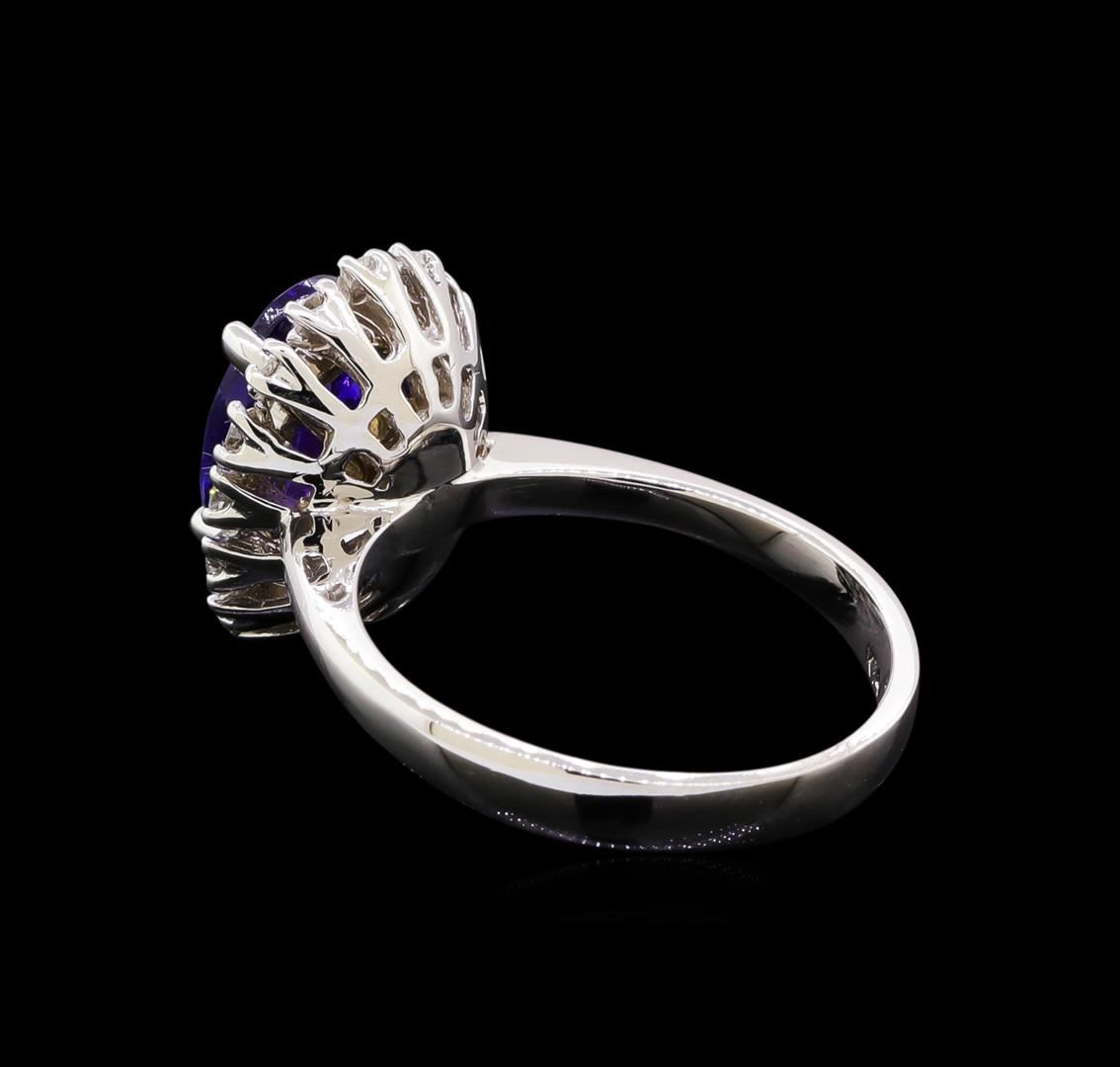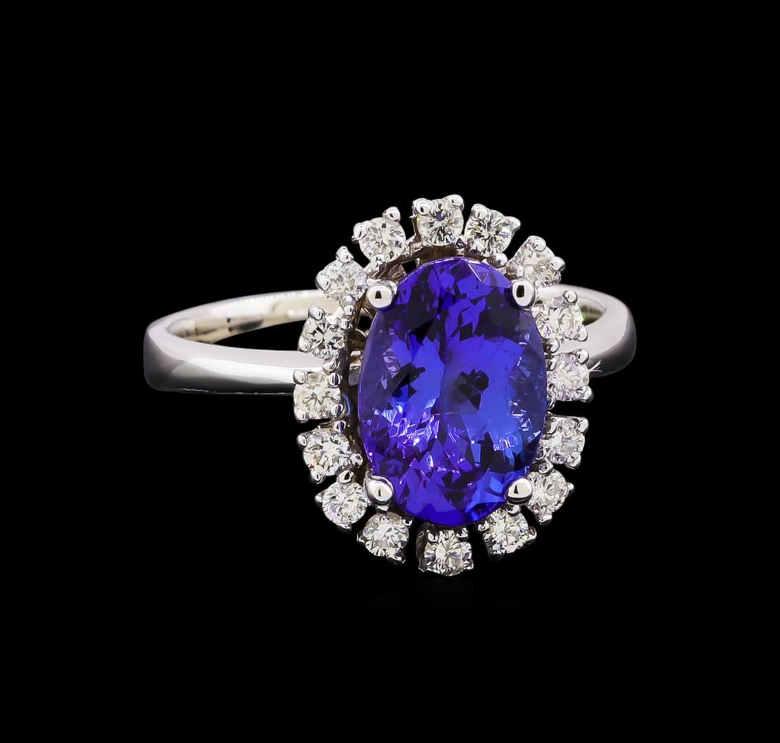 One electronically tested 14KT white gold lady's cast fashion halo ring with a bright polish finish. The featured lady's ring has a shank measuring 2.80 millimeters in width. Identified with markings of "K14". Condition is new, good workmanship. Containing: One prong set oval modified brilliant cut natural tanzanite, measuring 10.58 x 7.52 x 5.50mm, (depth est.) approximate weight of 3.02ct., clarity is eye clean, medium dark, moderately strong, bluish violet color, (GIA bV 6/4), cut is very good. Transmitting light with no distortion, transparent. Colored gemstones are presumed to have been subjected to commonly used enhancement processes. Graded in the setting. Sixteen prong set round brilliant cut diamonds, measuring 1.90 - 1.80 x 1.15mm (depth est.) approximate total weight of 16 Stones = 0.40ct. Graded in the setting. Clarity: SI-1 to SI-2. Color: G - Good. Total Weight of Colored Stones 3.02ct. Total Weight of Diamonds 0.40ct. Total Weight of Halo Ring 5.10gm. GAS Appraised at $5,900.00.