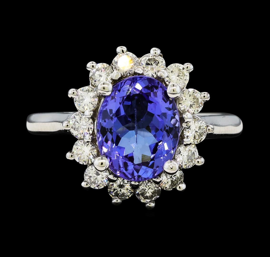 One electronically tested 14KT white gold lady's cast fashion ring with a basket halo with a bright polish finish. The featured lady's ring has a shank measuring 2.20 millimeters wide. Identified with markings of '14K'. Condition is new, good workmanship. Containing: One prong set oval modified brilliant cut natural tanzanite, measuring 10.00 x 7.88 x 5.05mm, (depth est.) 8%. bulge factor, approximate weight of 3.02ct., clarity is eye clean, medium light, moderately strong, violetish blue color, (GIA vB 4/4), cut is good. Transmitting light with no distortion, transparent. Colored gemstones are presumed to have been subjected to commonly used enhancement processes. Graded in the setting. Fourteen prong set round brilliant cut diamonds, measuring 2.50 - 2.40 x 1.47mm (depth est.) approximate total weight of 14 Stones = 0.75ct. Graded in the setting. Clarity SI-1 to I-1. Color: G - I Cut Good. Total Weight of Colored Stones 3.02ct.. Total Weight of Diamonds 0.75ct.. Total Weight of Ring 5.50gm. GAS Appraised at $5,940.00.