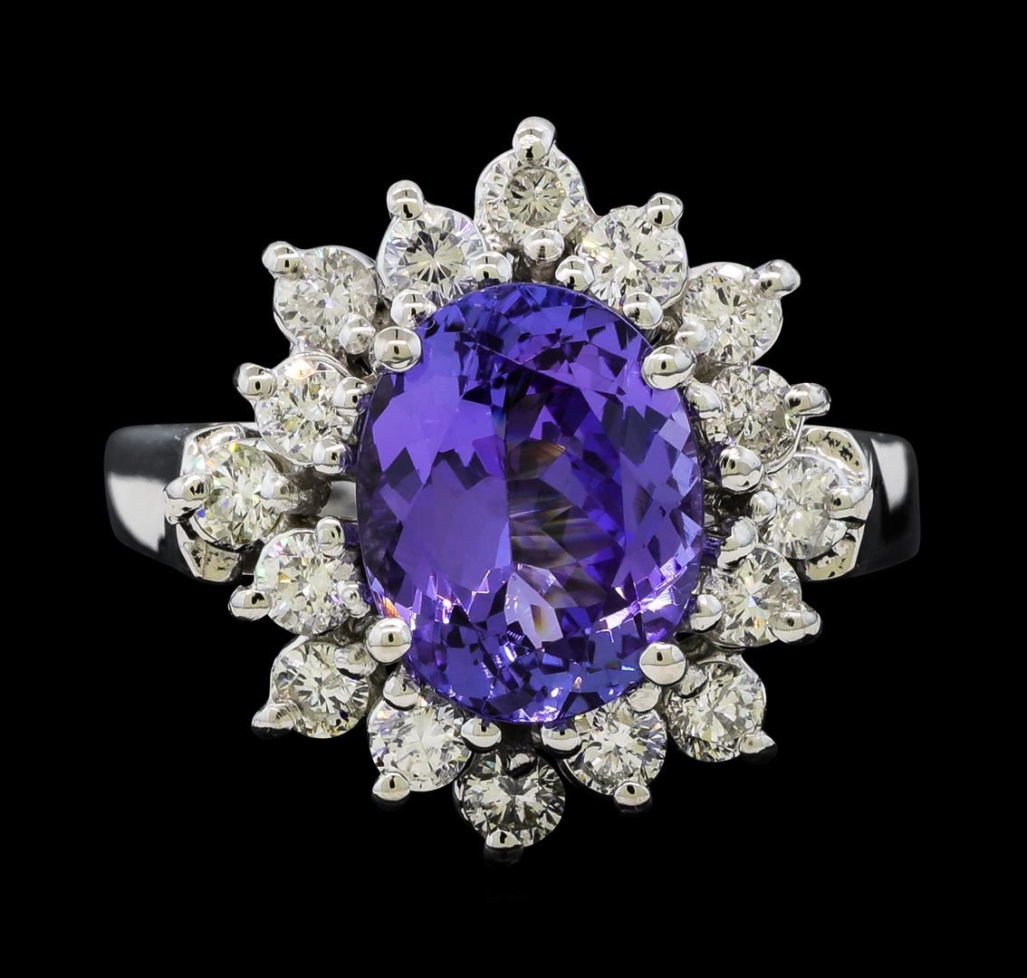 One electronically tested 14KT white gold lady's cast fashion ring with a staggered basket halo with a bright polish finish. The featured lady's ring has a shank measuring 2.14 millimeters wide. Identified with markings of '14K'. Condition is new, good workmanship. Containing: One prong set oval modified brilliant cut natural tanzanite, measuring 9.44 x 7.45 x 4.61mm, (depth est.) approximate weight of 2.37ct., clarity is eye clean, medium, moderately strong, violetish blue color, (GIA vB 5/4), cut is very good. Transmitting light with no distortion, transparent. Colored gemstones are presumed to have been subjected to commonly used enhancement processes. Graded in the setting. Sixteen prong set round brilliant cut diamonds, measuring 2.25 - 2.15 x 1.36mm (depth est.) approximate total weight of 16 Stones = 0.65ct. Graded in the setting. Clarity SI-1 to I-1. Color: G - H Cut Good. Total Weight of Colored Stones 2.37ct.. Total Weight of Diamonds 0.65ct.. Total Weight of Ring 5.20gm. GAS Appraised at $5,750.00.