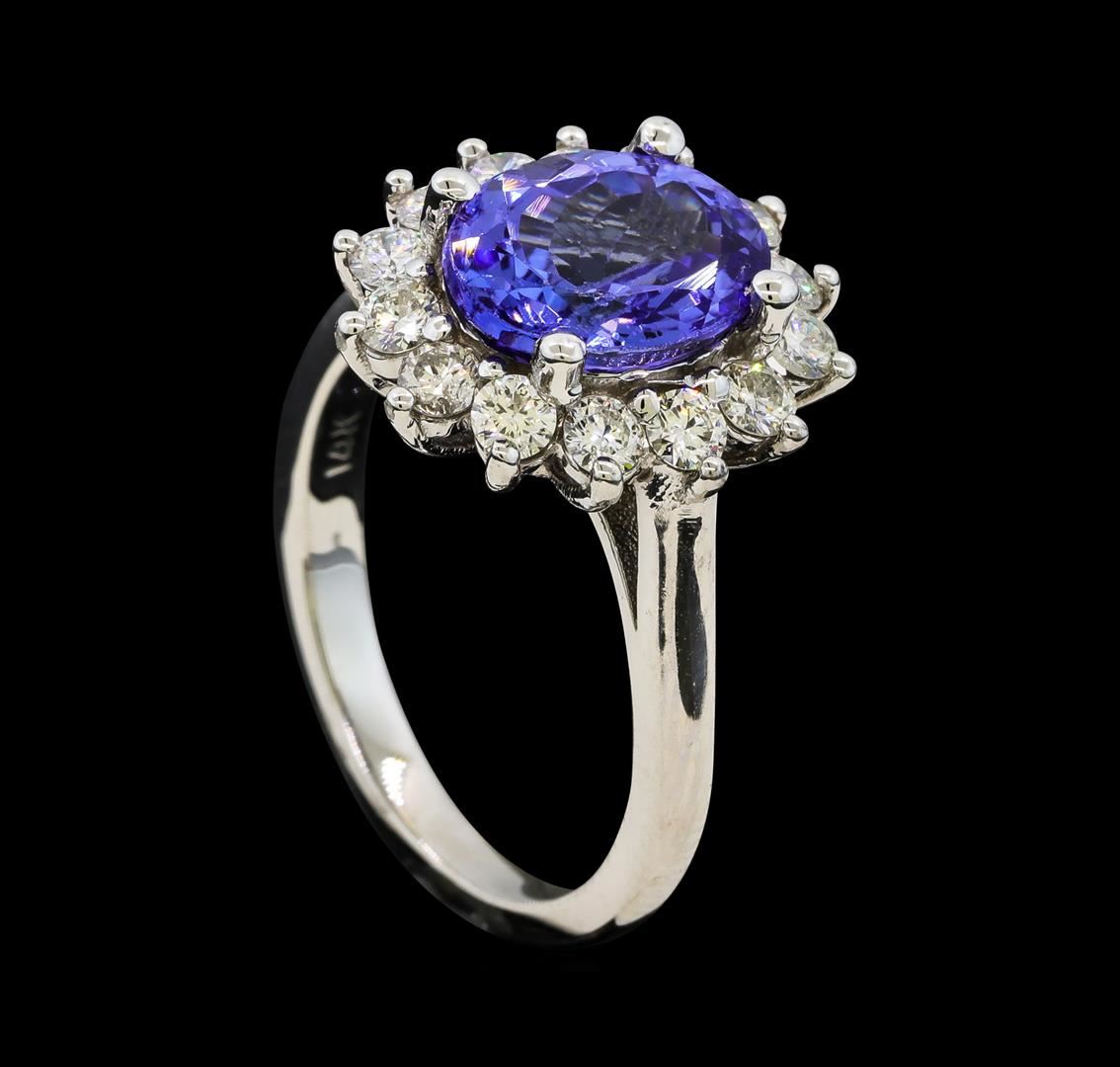 One electronically tested 14KT white gold lady's cast fashion ring with a basket halo with a bright polish finish. The featured lady's ring has a shank measuring 2.20 millimeters wide. Identified with markings of '14K'. Condition is new, good workmanship. Containing: One prong set oval modified brilliant cut natural tanzanite, measuring 10.00 x 7.88 x 5.05mm, (depth est.) 8%. bulge factor, approximate weight of 3.02ct., clarity is eye clean, medium light, moderately strong, violetish blue color, (GIA vB 4/4), cut is good. Transmitting light with no distortion, transparent. Colored gemstones are presumed to have been subjected to commonly used enhancement processes. Graded in the setting. Fourteen prong set round brilliant cut diamonds, measuring 2.50 - 2.40 x 1.47mm (depth est.) approximate total weight of 14 Stones = 0.75ct. Graded in the setting. Clarity SI-1 to I-1. Color: G - I Cut Good. Total Weight of Colored Stones 3.02ct.. Total Weight of Diamonds 0.75ct.. Total Weight of Ring 5.50gm. GAS Appraised at $5,940.00.