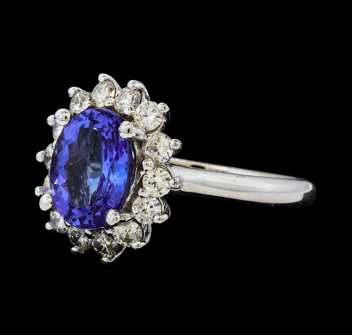 One electronically tested 14KT white gold lady's cast fashion ring with a basket halo with a bright polish finish. The featured lady's ring has a shank measuring 2.20 millimeters wide. Identified with markings of '14K'. Condition is new, good workmanship. Containing: One prong set oval modified brilliant cut natural tanzanite, measuring 10.00 x 7.88 x 5.05mm, (depth est.) 8%. bulge factor, approximate weight of 3.02ct., clarity is eye clean, medium light, moderately strong, violetish blue color, (GIA vB 4/4), cut is good. Transmitting light with no distortion, transparent. Colored gemstones are presumed to have been subjected to commonly used enhancement processes. Graded in the setting. Fourteen prong set round brilliant cut diamonds, measuring 2.50 - 2.40 x 1.47mm (depth est.) approximate total weight of 14 Stones = 0.75ct. Graded in the setting. Clarity SI-1 to I-1. Color: G - I Cut Good. Total Weight of Colored Stones 3.02ct.. Total Weight of Diamonds 0.75ct.. Total Weight of Ring 5.50gm.