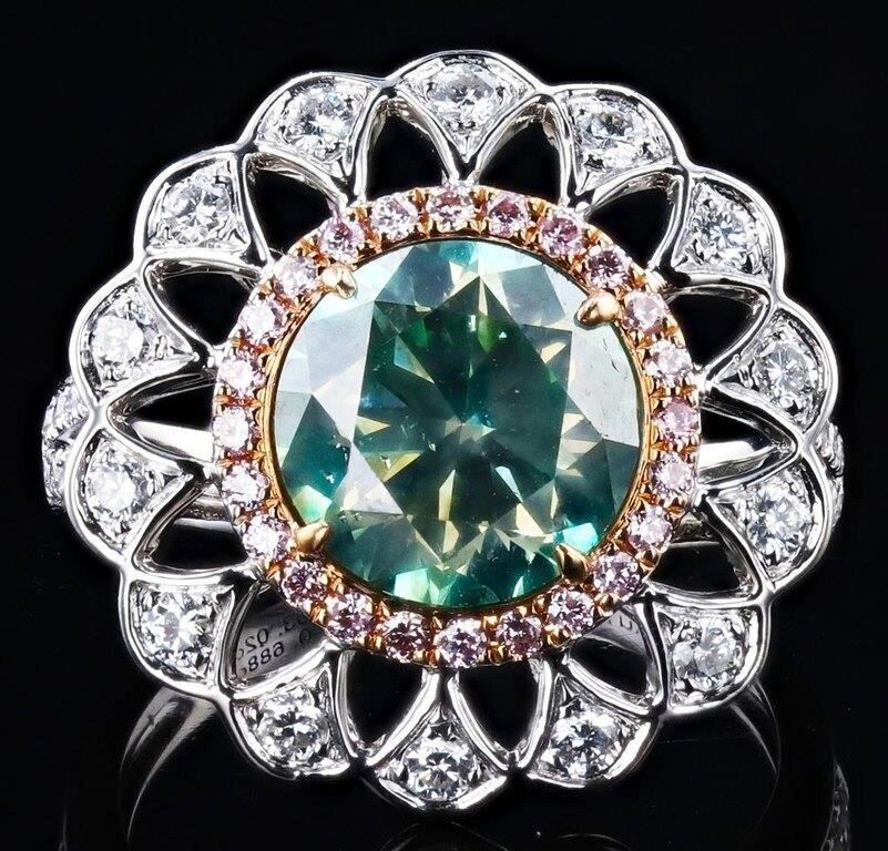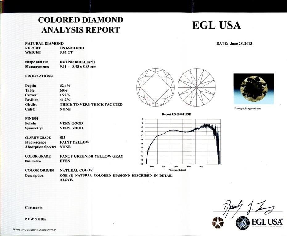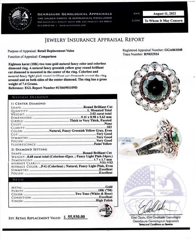Eighteen karat (18K) two tone gold natural fancy color and colorless diamond ring. A natural fancy greenish yellow gray round brilliant cut diamond is mounted in the center of the ring. Colorless and natural fancy light pink round brilliant cut diamonds accent the ring around and on both sides of the center diamond. The ring has a gross weight of 7.4 Grams. Reference: EGL Report Number #US66901109D #NATURAL DIAMOND# 1) CENTER DIAMOND SHAPE: Round Brilliant Cut QUANTITY: 1, Mounted Total WEIGHT: 3.02 carat total DIMENSIONS: 9.11 x 8.98 x 5.63mm GIRDLE: Thick to Very Thick, Faceted CULET: None CLARITY: SI3 COLOR: Natural, Fancy Greenish Yellow Gray, Even CUT: Very Good SYMMETRY: Very Good POLISH: Very Good FLUORESCENCE: Faint Yellow 2) DIAMOND SETTING SHAPE: Round Brilliant Cut WEIGHT: .0.68 carat total (Colorless-42pcs., Fancy Light Pink-24pcs.) DIMENSION: 1.7x 1.7mm AVERAGE CLARITY: VS1-VS2 AVERAGE COLOR: F-G (Colorless), Natural, Fancy Light Pink, Even SYMMETRY: Excellent POLISH: Excellent #METAL# METAL: Gold PURITY: 18K (750) COLOR: Two Tone (White and Rose) CONDITION: Excellent FINISH: High Polish