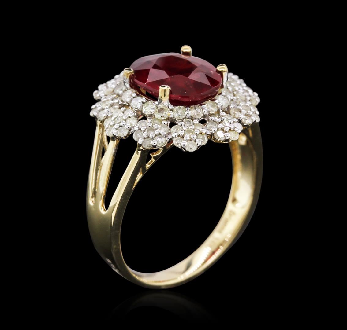 Fourteen karat (14K) yellow gold ruby and diamond ring. An oval cut ruby corundum gemstone is prong mounted in the center of the ring. Round brilliant cut diamonds accent the ring around the center gemstone and on both sides. The ring is cast stamped "14K" and has a gross weight of 4.2 Grams. Diamond(s): Shape: Round Brilliant Cut. Weight: 0.88 carat. Average Clarity: I1-I2. Average Color: I-K. Symmetry: Very Good. Polish: Very Good. Gemstone(s): GemStone: Ruby Corundum. Nature: Natural. Shape: Oval, Faceted. Quantity: 1, Mounted. Weight 3.02 carat. Dimensions: Length-10.20 mm. ; Width- 8.12 mm. Bulge: Visible. Clarity: I1, Type 3. Color: Red (5/5). Symmetry: Very Good. Color Intensity: Medium. Transparency: Transparent. Tone: Dark. Enhancements: Indications of high temperature heat treatment, with glass and flux additives. Metal(s): Metal: Gold, Stamped. Purity: 14K. Color: Yellow. Condition: Excellent. Finish: High polish. GGA Appraised.