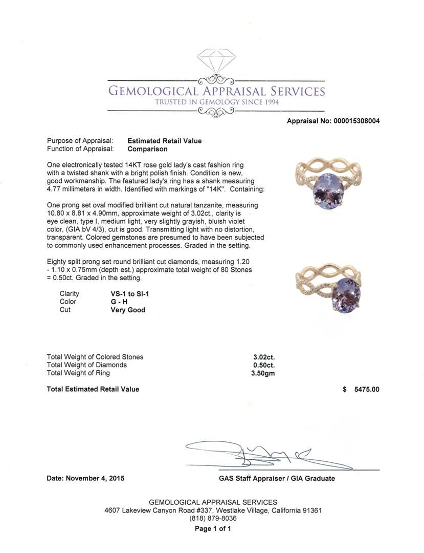 One electronically tested 14KT rose gold lady's cast fashion ring with a twisted shank with a bright polish finish. The featured lady's ring has a shank measuring 4.77 millimeters in width. Identified with markings of "14K". Condition is new, good workmanship. Containing: One prong set oval modified brilliant cut natural tanzanite, measuring 10.80 x 8.81 x 4.90mm, approximate weight of 3.02ct., clarity is eye clean, type I, medium light, very slightly grayish, bluish violet color, (GIA bV 4/3), cut is good. Transmitting light with no distortion, transparent. Colored gemstones are presumed to have been subjected to commonly used enhancement processes. Graded in the setting. Eighty split prong set round brilliant cut diamonds, measuring 1.20 - 1.10 x 0.75mm (depth est.) approximate total weight of 80 Stones = 0.50ct. Graded in the setting. Clarity: VS-1 to SI-1. Color: G - Very Good. Total Weight of Colored Stones 3.02ct. Total Weight of Diamonds 0.50ct. Total Weight of Ring 3.50gm GAS Appraised at $5,475.00.