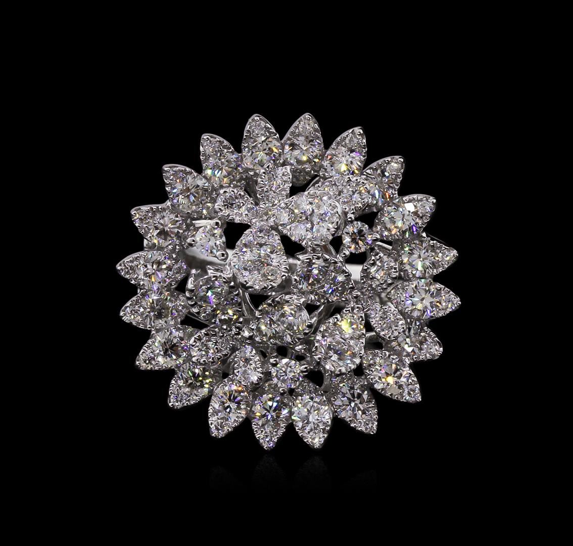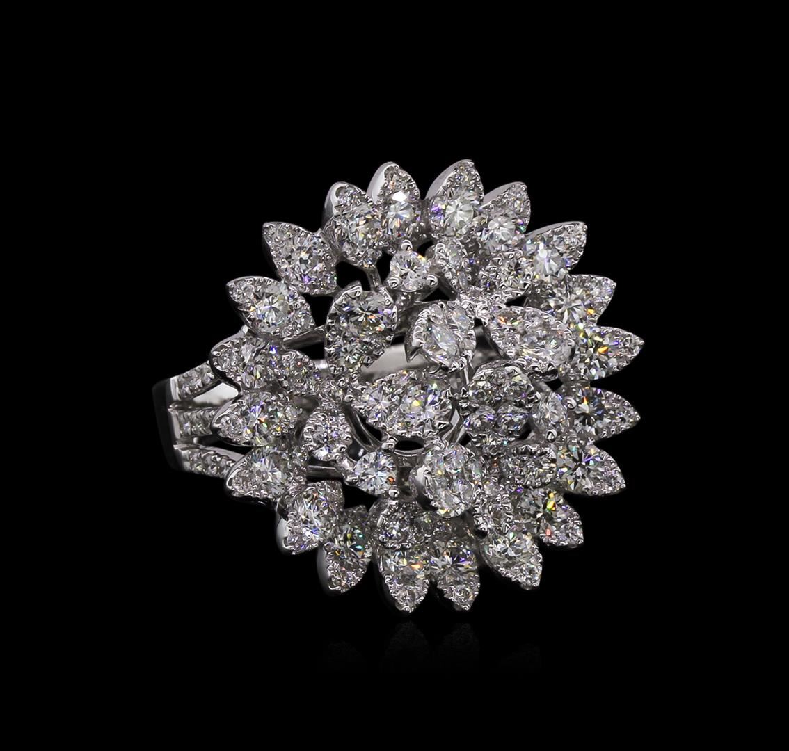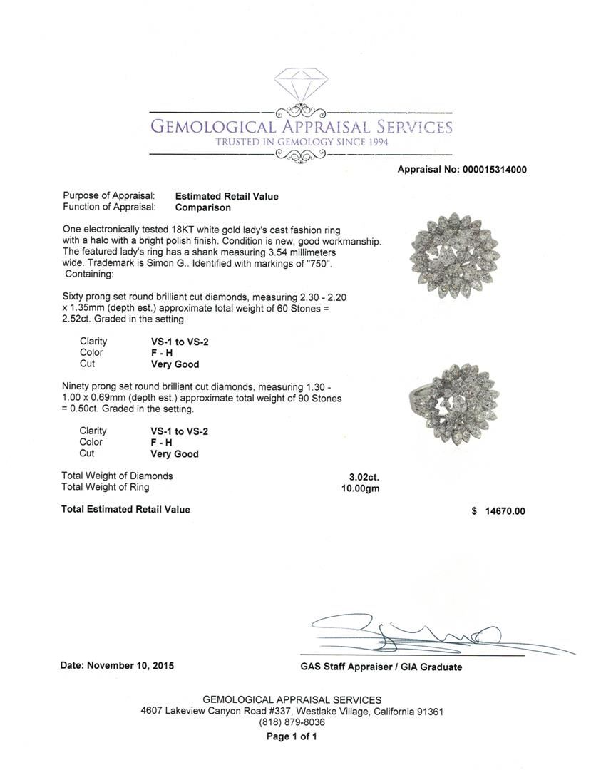 One electronically tested 18KT white gold lady's cast fashion ring with a halo with a bright polish finish. The featured lady's ring has a shank measuring 3.54 millimeters wide. Trademark is Simon G. Identified with markings of "750". Condition is new, good workmanship. Containing: Sixty prong set round brilliant cut diamonds, measuring 2.30 - 2.20 x 1.35mm (depth est.) approximate total weight of 60 Stones = 2.52ct. Graded in the setting. Clarity: VS-1 to VS-2. Color: F - Very Good Ninety prong set round brilliant cut diamonds, measuring 1.30 - 1.00 x 0.69mm (depth est.) approximate total weight of 90 Stones = 0.50ct. Graded in the setting. Clarity: VS-1 to VS-2. Color: F - Very Good. Total Weight of Diamonds 3.02ct. Total Weight of Ring 10.00gm. GAS Appraised at $14,670.00.