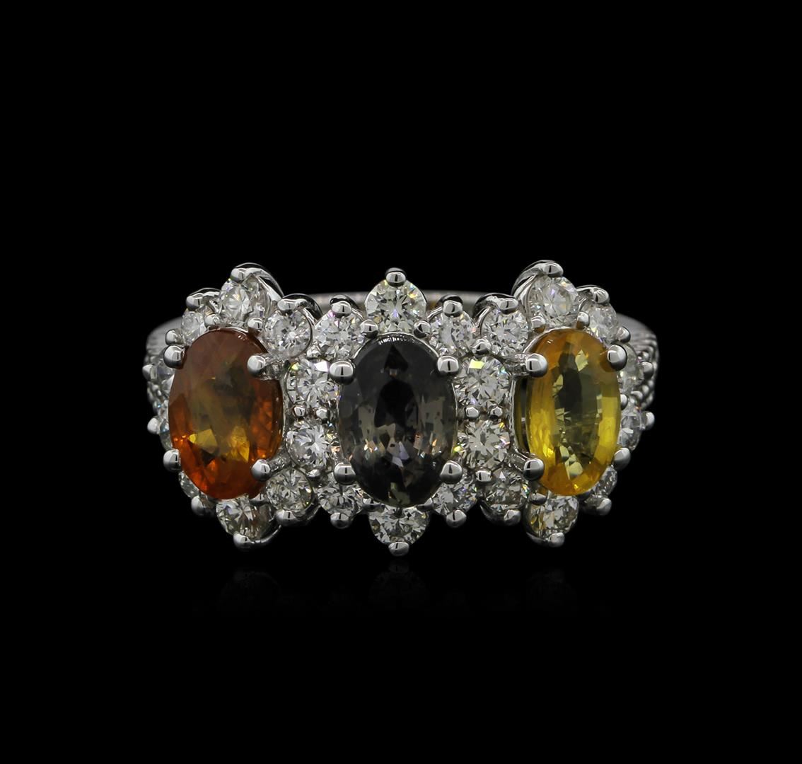 One 14KT white gold lady's cast 3-stone halo ring with a bright polish finish. The featured ladies ring has a 2.9mm shank. Identified with markings of "K14". Condition is new, good workmanship. Containing: One prong set oval mixed cut natural purple sapphire, measuring 7.18 x 5.00 x 3.27mm, approximate weight of 1.00ct., clarity is slightly included, type II, medium light, very slightly grayish, purple red color, (GIA PR 4/3), cut is good. Transmitting light somewhat diffusely, semi-transparent to translucent. Colored gemstones are presumed to have been subjected to commonly used enhancement processes. Graded in the setting. One prong set oval mixed cut natural orange sapphire, measuring 6.90 x 5.10 x 3.60mm, approximate weight of 1.02ct., clarity is moderately included, type II, medium dark, brownish, yellowish orange color, (GIA yO 6/3), cut is good. Transmitting light somewhat diffusely, semi-transparent to translucent. Colored gemstones are presumed to have been subjected to commonly used enhancement processes. Graded in the setting. One prong set oval mixed cut natural yellow sapphire, measuring 6.95 x 4.70 x 3.50mm, approximate weight of 1.00ct., clarity is eye clean, type II, medium light, yellow color, (GIA Y 4/0), cut is good. Transmitting light somewhat diffusely, transparent to translucent. Colored gemstones are presumed to have been subjected to commonly used enhancement processes. Graded in the setting. Fourteen prong set round brilliant cut diamonds, measuring 2.30 - 2.25 x 1.48mm (depth est.) approximate. Total Weight of 14 Stones = 0.68ct. Graded in the setting. Clarity: SI-1 to SI-2. Color: H - I. Cut Good Twelve prong set round brilliant cut diamonds, measuring 2.00 - 1.95 x 1.23mm (depth est.) approximate. Total Weight of 12 Stones = 0.37ct. Graded in the setting. Clarity: SI-1 to SI-2. Color: H - I. Cut Good Twenty prong set round brilliant cut diamonds, measuring 1.10 - 1.00 x 0.68mm (depth est.) approximate. Total Weight of 20 Stones = 0.09ct. Graded in the setting. Clarity: SI-1 to I-1. Color: H - I. Cut Good. Total Weight of Colored Stones 3.02ct. Total Weight of Diamonds 1.14ct. Total Weight of Ring 5.20gm. GAS Appraised at $4,570.00.