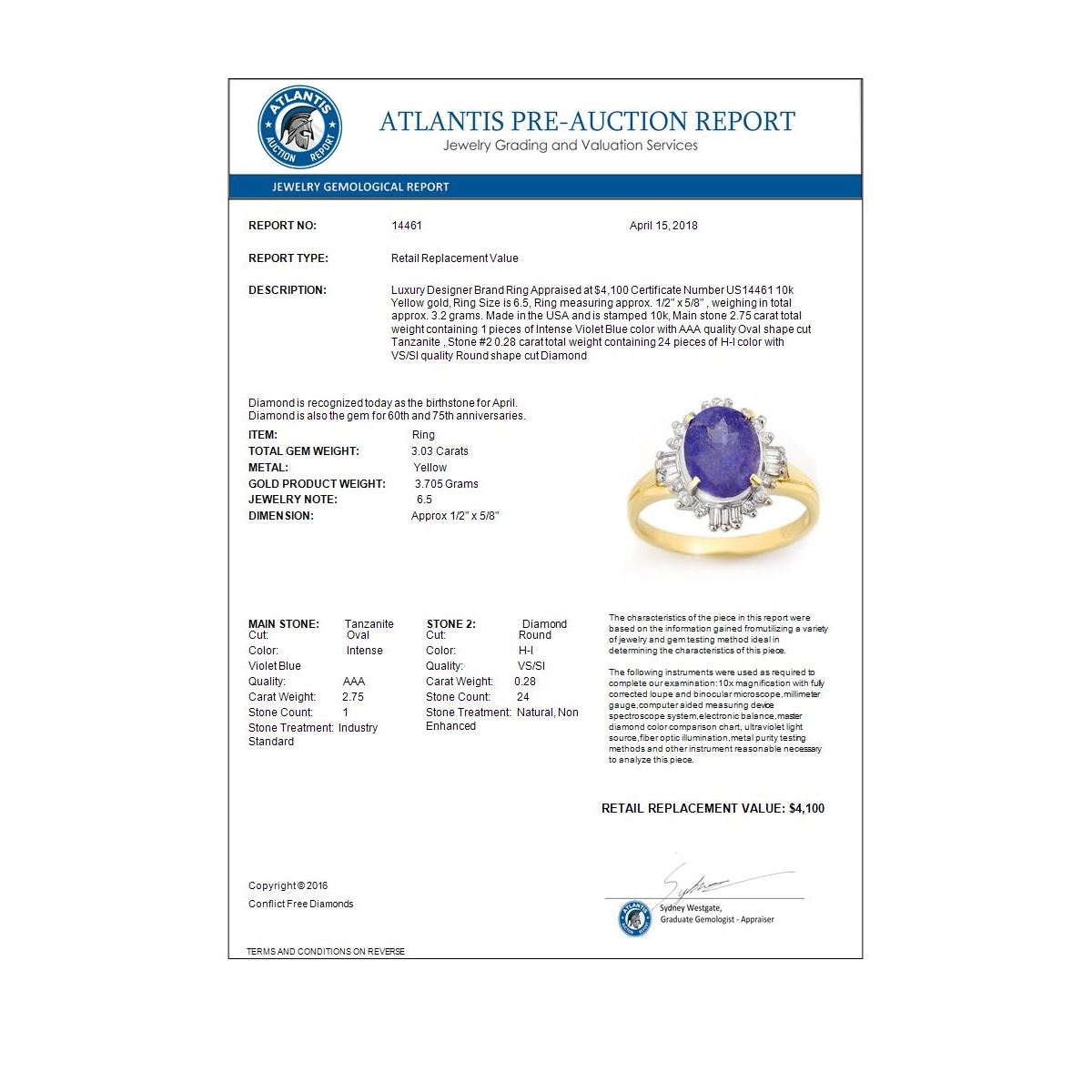 REF-57H6A -14461 ---- 3.03 CTW Tanzanite & Diamond Ring 10K Yellow Gold ---- Luxury Designer Brand Ring Appraised at $4,100 Certificate Number US14461 10k Yellow gold, Ring Size is 6.5, Ring measuring approx. 1/2" x 5/8" , weighing in total approx. 3.2 grams. Made in the USA and is stamped 10k, Main stone 2.75 carat total weight containing 1 pieces of Intense Violet Blue color with AAA quality Oval shape cut Tanzanite , Stone #2 0.28 carat total weight containing 24 pieces of H-I color with VS/SI quality Round shape cut Diamond