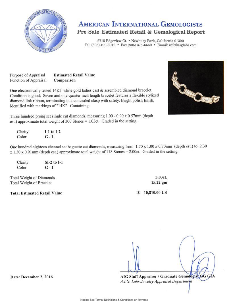 One electronically tested 14KT white gold ladies cast & assembled diamond bracelet. Seven and one-quarter inch length bracelet features a flexible stylized diamond link ribbon, terminating in a concealed clasp with safety. Bright polish finish. Identified with markings of '14K'. Condition is good. Containing: Three Hundred prong set single cut diamonds, measuring 1.00 - 0.90 x 0.57mm (depth est.) approximate total weight of 300 Stones = 1.03ct. Graded in the setting. Clarity I-1 to I-2. Color: G - I One Hundred Eighteen channel set baguette cut diamonds, measuring from 1.70 x 1.00 x 0.70mm (depth est.) to 2.30 x 1.30 x 0.91mm (depth est.) approximate total weight of 118 Stones = 2.00ct. Graded in the setting. Clarity SI-2 to I-1. Color: G - I. Total Weight of Diamonds 3.03ct.. Total Weight of Bracelet 15.22gm. AIG Appraised at $8,150.00.