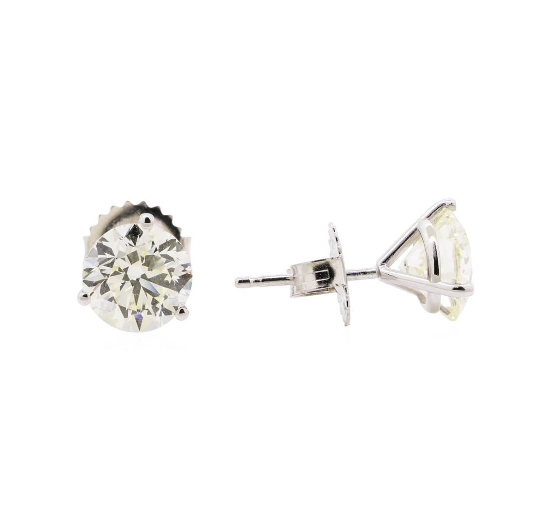 One pair electronically tested 14KT white gold lady's cast fashion stud earrings with heavy friction backs with a three prong basket with a bright polish finish. Identified with markings of '14K'. Condition is new, good workmanship. Containing: Two prong set round brilliant cut diamonds, measuring 7.35 - 7.15 x 4.50mm (depth est.) , 5.00.%. GTCF approximate total weight of 2 Stones = 3.03ct. Graded in the setting. Color I - J Clarity VS-1 to VS-2 Cut Very Good. Total Weight of Diamonds 3.03ct.. Total Weight of Earrings 1.40gm GAS Appraised at $40310.00. GAS Appraised at $40,310.00.