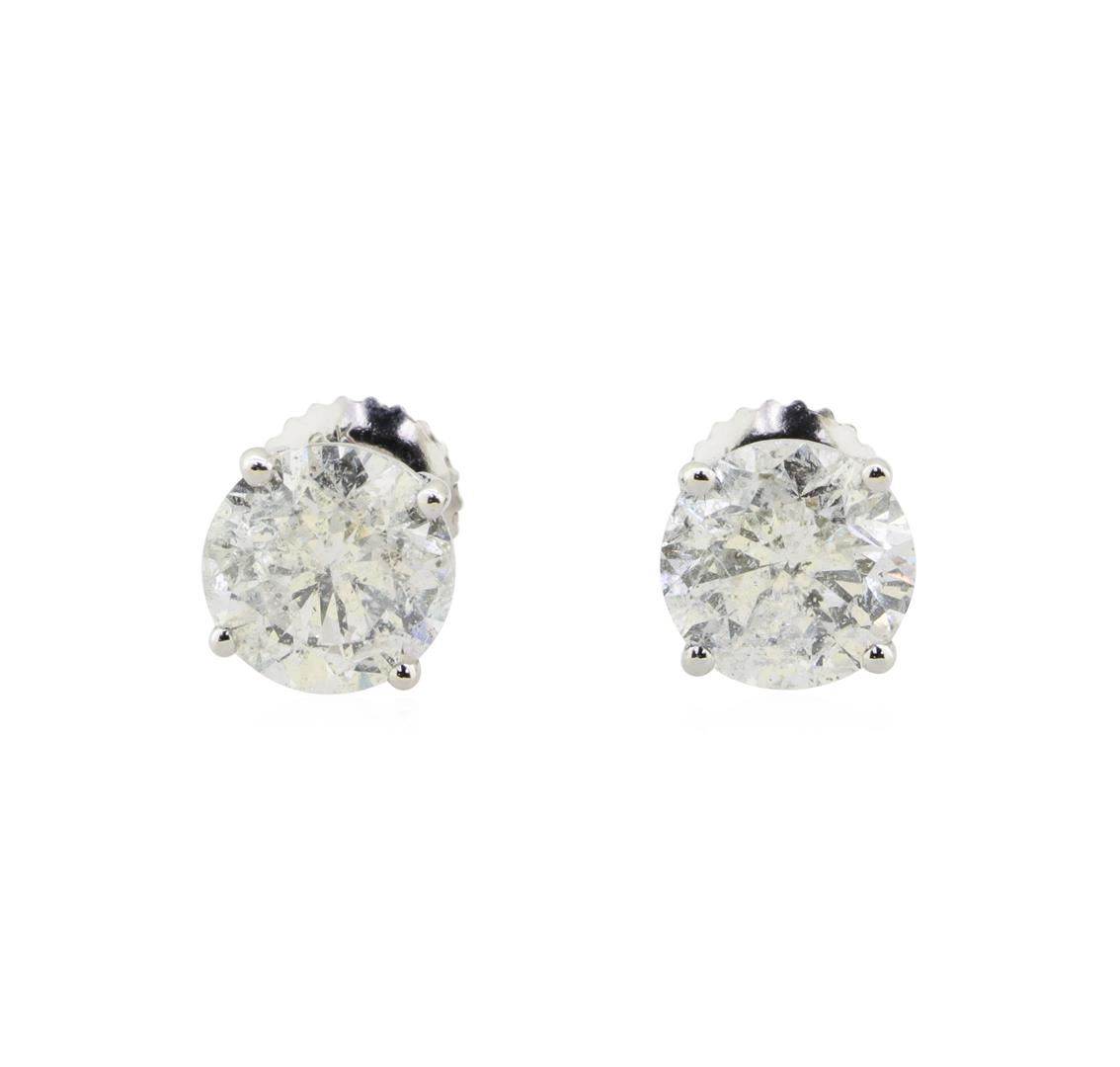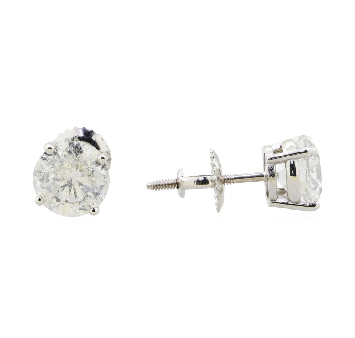 One pair electronically tested 18KT white gold cast & assembled diamond solitaire earrings with screw backs. Condition is new, good workmanship. Containing: One prong set round brilliant cut diamond, measuring 7.20 - 7.10 x 4.50mm (depth est.), 7.00% GTCF approximate weight of 1.51ct with a medium blue fluorescence. Graded in the setting. Clarity I-2 Color G Depth 62.9% Table 55.9% One prong set round brilliant cut diamond, measuring 7.22 - 7.20 x 4.50mm (depth est.), 7.00% GTCF approximate weight of 1.52ct with a medium blue fluorescence. Graded in the setting. Clarity I-2 Color H Depth 62.4% Table 56.9% Total Weight of Diamonds 3.03 ct. Total Weight of Earrings 2.10 gm Estimated Retail Value $ 21,000.00 US