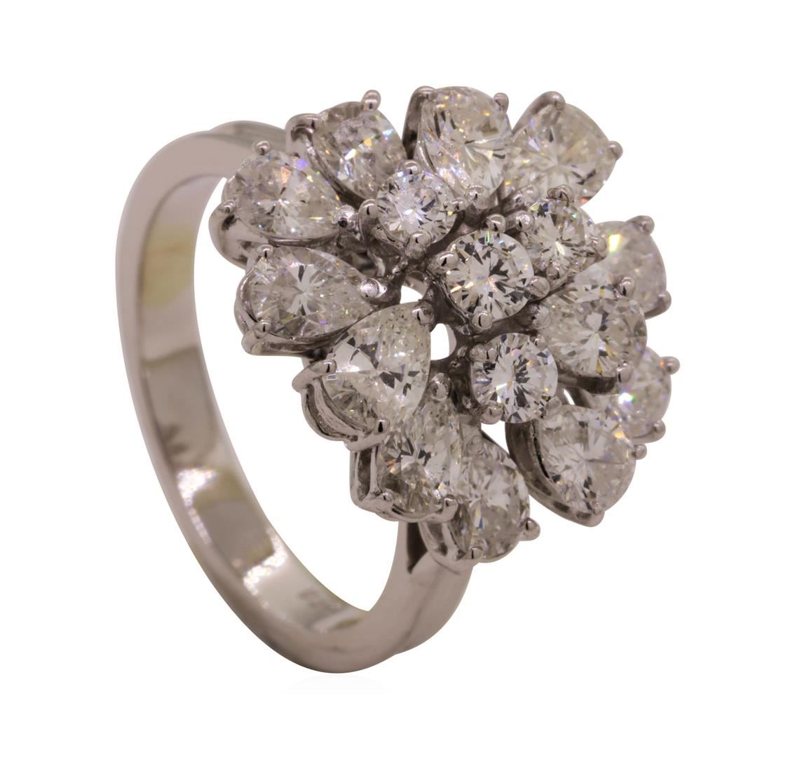 One electronically tested 18KT white gold lady's cast fashion ring with a waterfall cluster motif with a bright polish finish. The featured lady's ring has a shank measuring 2.70 millimeters wide. Identified with markings of '750'. Condition is like new, good workmanship. Containing: Twelve prong set pear shaped cut diamonds, measuring 5.40 x 3.30 x 2.08mm (depth est.) approximate total weight of 12 Stones = 2.62ct. Graded in the setting. Color G - H Clarity VS-1 to SI-1 Cut Good Four prong set round brilliant cut diamonds, measuring 3.10 - 3.00 x 1.83mm (depth est.) approximate total weight of 4 Stones = 0.41ct. Graded in the setting. Color G - H Clarity VS-2 to SI-1 Cut Very Good. Total Weight of Diamonds 3.03ct.. Total Weight of Ring 5.70gm GAS Appraised at $9080.00. GAS Appraised at $9,080.00.