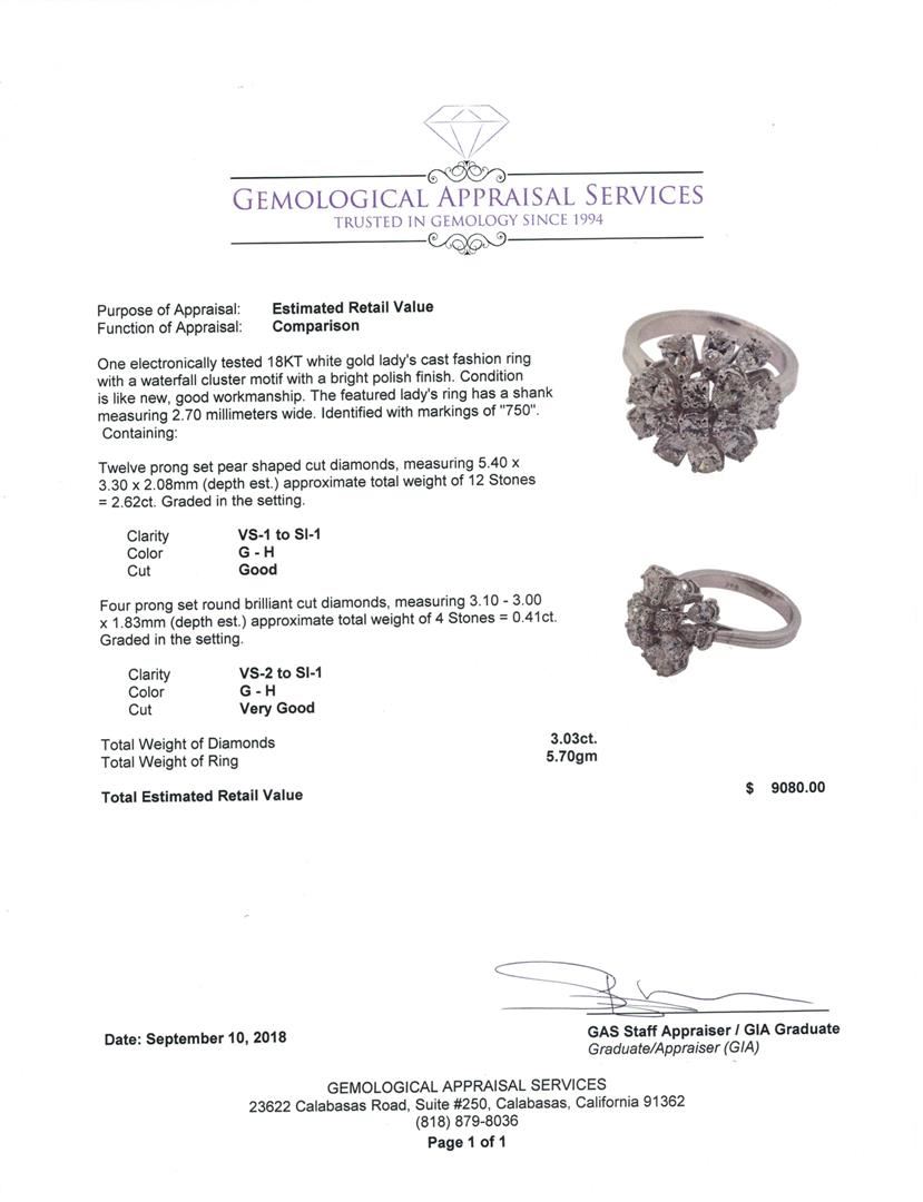 One electronically tested 18KT white gold lady's cast fashion ring with a waterfall cluster motif with a bright polish finish. The featured lady's ring has a shank measuring 2.70 millimeters wide. Identified with markings of '750'. Condition is like new, good workmanship. Containing: Twelve prong set pear shaped cut diamonds, measuring 5.40 x 3.30 x 2.08mm (depth est.) approximate total weight of 12 Stones = 2.62ct. Graded in the setting. Color G - H Clarity VS-1 to SI-1 Cut Good Four prong set round brilliant cut diamonds, measuring 3.10 - 3.00 x 1.83mm (depth est.) approximate total weight of 4 Stones = 0.41ct. Graded in the setting. Color G - H Clarity VS-2 to SI-1 Cut Very Good. Total Weight of Diamonds 3.03ct.. Total Weight of Ring 5.70gm GAS Appraised at $9080.00. GAS Appraised at $9,080.00.