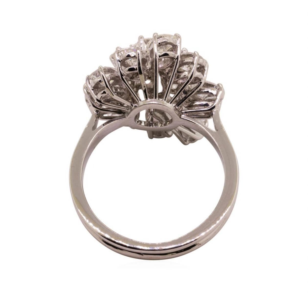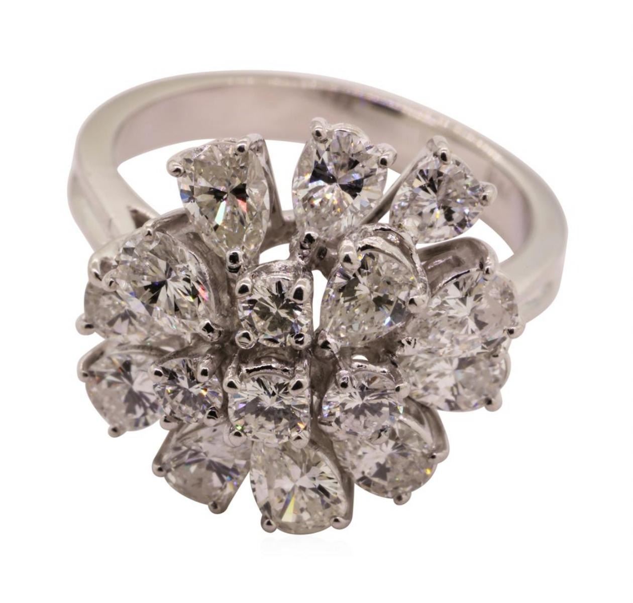 One electronically tested 18KT white gold lady's cast fashion ring with a waterfall cluster motif with a bright polish finish. The featured lady's ring has a shank measuring 2.70 millimeters wide. Identified with markings of '750'. Condition is like new, good workmanship. Containing: Twelve prong set pear shaped cut diamonds, measuring 5.40 x 3.30 x 2.08mm (depth est.) approximate total weight of 12 Stones = 2.62ct. Graded in the setting. Color G - H Clarity VS-1 to SI-1 Cut Good Four prong set round brilliant cut diamonds, measuring 3.10 - 3.00 x 1.83mm (depth est.) approximate total weight of 4 Stones = 0.41ct. Graded in the setting. Color G - H Clarity VS-2 to SI-1 Cut Very Good. Total Weight of Diamonds 3.03ct.. Total Weight of Ring 5.70gm GAS Appraised at  $9080.00. GAS Appraised.