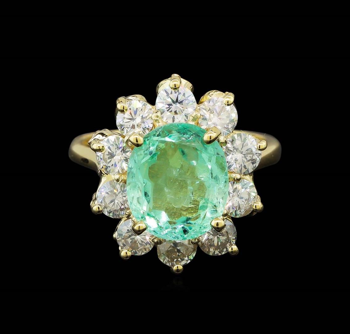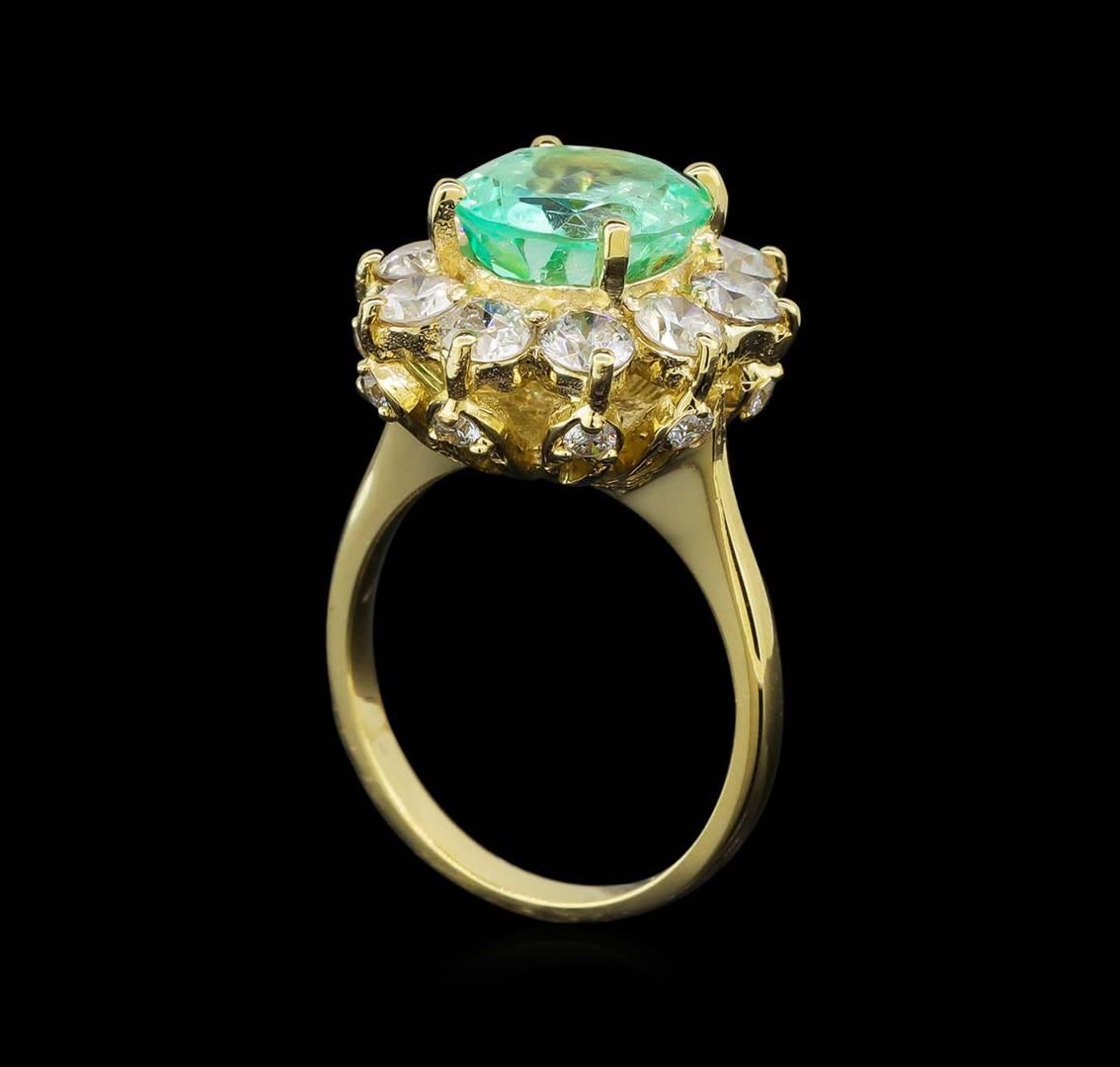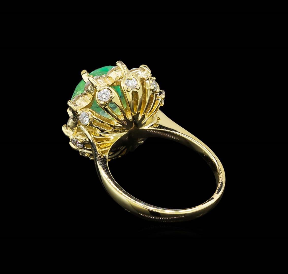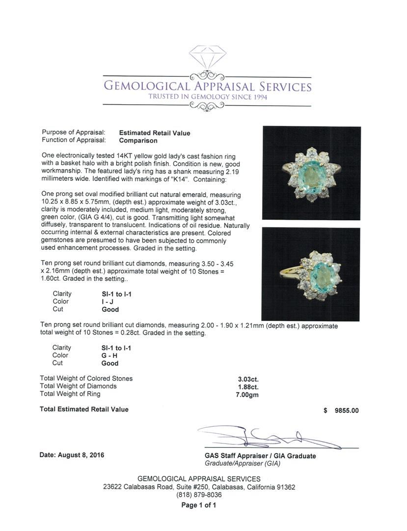One electronically tested 14KT yellow gold lady's cast fashion ring with a basket halo with a bright polish finish. The featured lady's ring has a shank measuring 2.19 millimeters wide. Identified with markings of 'K14'. Condition is new, good workmanship. Containing: One prong set oval modified brilliant cut natural emerald, measuring 10.25 x 8.85 x 5.75mm, (depth est.) approximate weight of 3.03ct., clarity is moderately included, medium light, moderately strong, green color, (GIA G 4/4), cut is good. Transmitting light somewhat diffusely, transparent to translucent. Indications of oil residue. Naturally occurring internal & external characteristics are present. Colored gemstones are presumed to have been subjected to commonly used enhancement processes. Graded in the setting. Ten prong set round brilliant cut diamonds, measuring 3.50 - 3.45 x 2.16mm (depth est.) approximate total weight of 10 Stones = 1.60ct. Graded in the setting. Clarity SI-1 to I-1. Color: I - J Cut Good Ten prong set round brilliant cut diamonds, measuring 2.00 - 1.90 x 1.21mm (depth est.) approximate total weight of 10 Stones = 0.28ct. Graded in the setting. Clarity SI-1 to I-1. Color: G - H Cut Good. Total Weight of Colored Stones 3.03ct.. Total Weight of Diamonds 1.88ct.. Total Weight of Ring 7.00gm. GAS Appraised at $9,855.00.