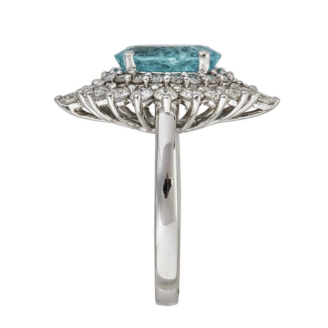 One 18KT white gold ring, weighing in total approx. 5.1 dwt., stamped "18K CJ 3.03", containing the following: One natural paraiba tourmaline, oval shape modified brilliant, measuring approx. 11.00 x 8.30 x 4.95 mm, weight estimated by formula 3.03ct, color: greenish blue transparent - good, color uniformity: good, proportions: good. Twenty natural diamonds, round brilliant, measuring approx. 2.40 - 2.60 mm, weight estimated at 0.0585ct each, in total 1.17ct, color: near colorless, clarity: I1, polish/symmetry: good/good. Eighteen natural diamonds, round brilliant, measuring approx. 1.70 mm in diameter, weight estimated at 0.02ct each, in total 0.36ct, color: near colorless, clarity: I1, polish/symmetry: good/good. IGI Appraised at $17,730.00.