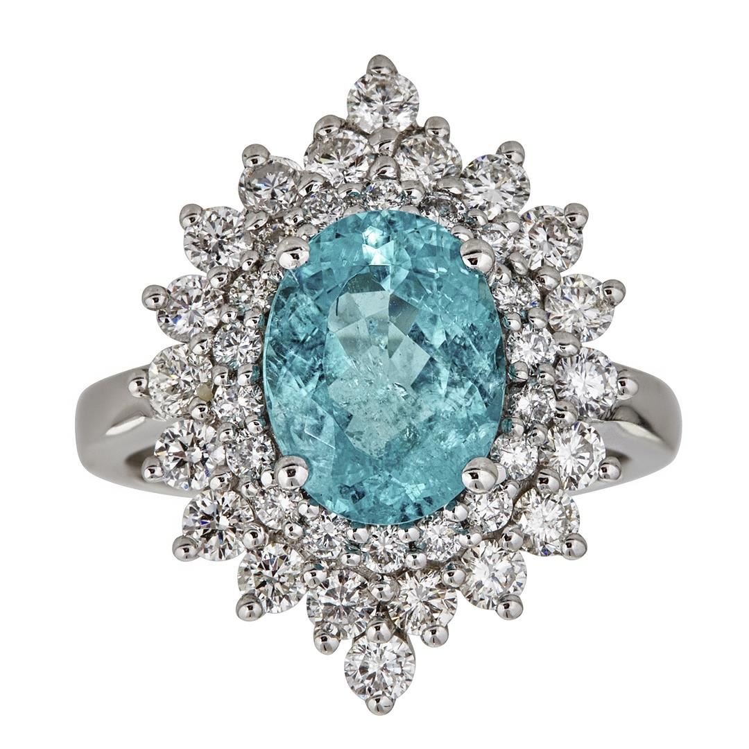 One 18KT white gold ring, weighing in total approx. 5.1 dwt., stamped "18K CJ 3.03", containing the following: One natural paraiba tourmaline, oval shape modified brilliant, measuring approx. 11.00 x 8.30 x 4.95 mm, weight estimated by formula 3.03ct, color: greenish blue transparent - good, color uniformity: good, proportions: good. Twenty natural diamonds, round brilliant, measuring approx. 2.40 - 2.60 mm, weight estimated at 0.0585ct each, in total 1.17ct, color: near colorless, clarity: I1, polish/symmetry: good/good. Eighteen natural diamonds, round brilliant, measuring approx. 1.70 mm in diameter, weight estimated at 0.02ct each, in total 0.36ct, color: near colorless, clarity: I1, polish/symmetry: good/good. IGI Appraised at $17,730.00.