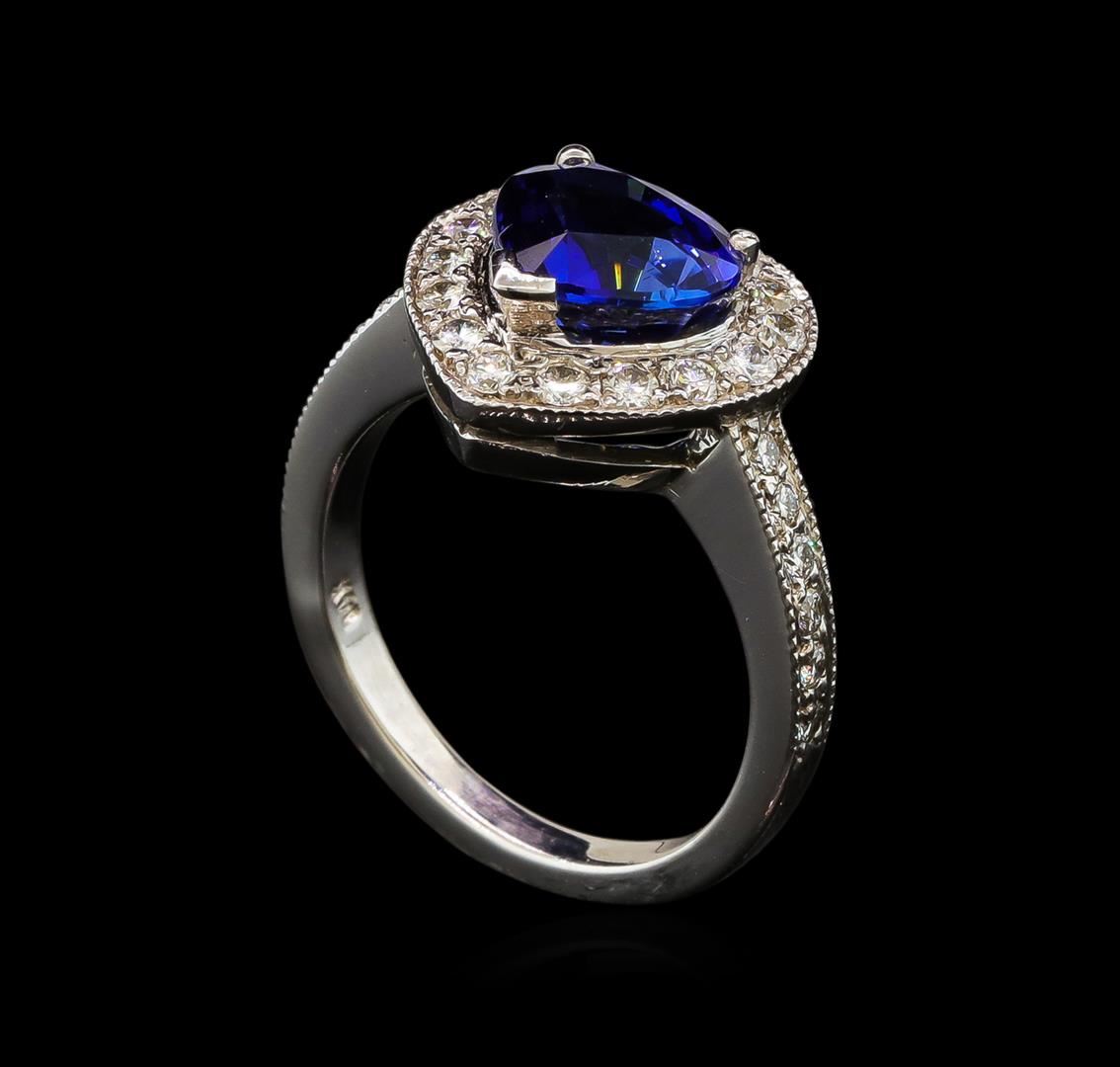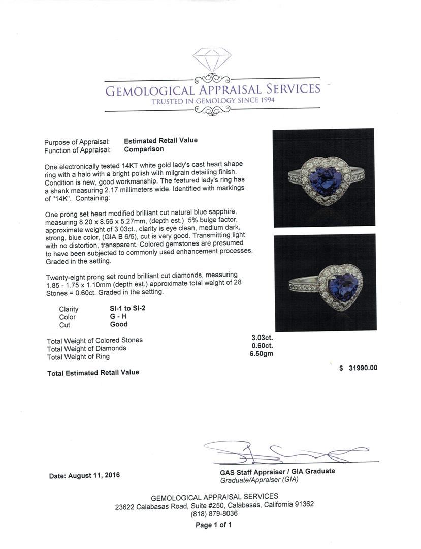 One electronically tested 14KT white gold lady's cast heart shape ring with a halo with a bright polish with milgrain detailing finish. The featured lady's ring has a shank measuring 2.17 millimeters wide. Identified with markings of '14K'. Condition is new, good workmanship. Containing: One prong set heart modified brilliant cut natural blue sapphire, measuring 8.20 x 8.56 x 5.27mm, (depth est.) 5%. bulge factor, approximate weight of 3.03ct., clarity is eye clean, medium dark, strong, blue color, (GIA B 6/5), cut is very good. Transmitting light with no distortion, transparent. Colored gemstones are presumed to have been subjected to commonly used enhancement processes. Graded in the setting. Twenty-Eight prong set round brilliant cut diamonds, measuring 1.85 - 1.75 x 1.10mm (depth est.) approximate total weight of 28 Stones = 0.60ct. Graded in the setting. Clarity SI-1 to SI-2. Color: G - H Cut Good. Total Weight of Colored Stones 3.03ct.. Total Weight of Diamonds 0.60ct.. Total Weight of Ring 6.50gm. GAS Appraised at $31,990.00.