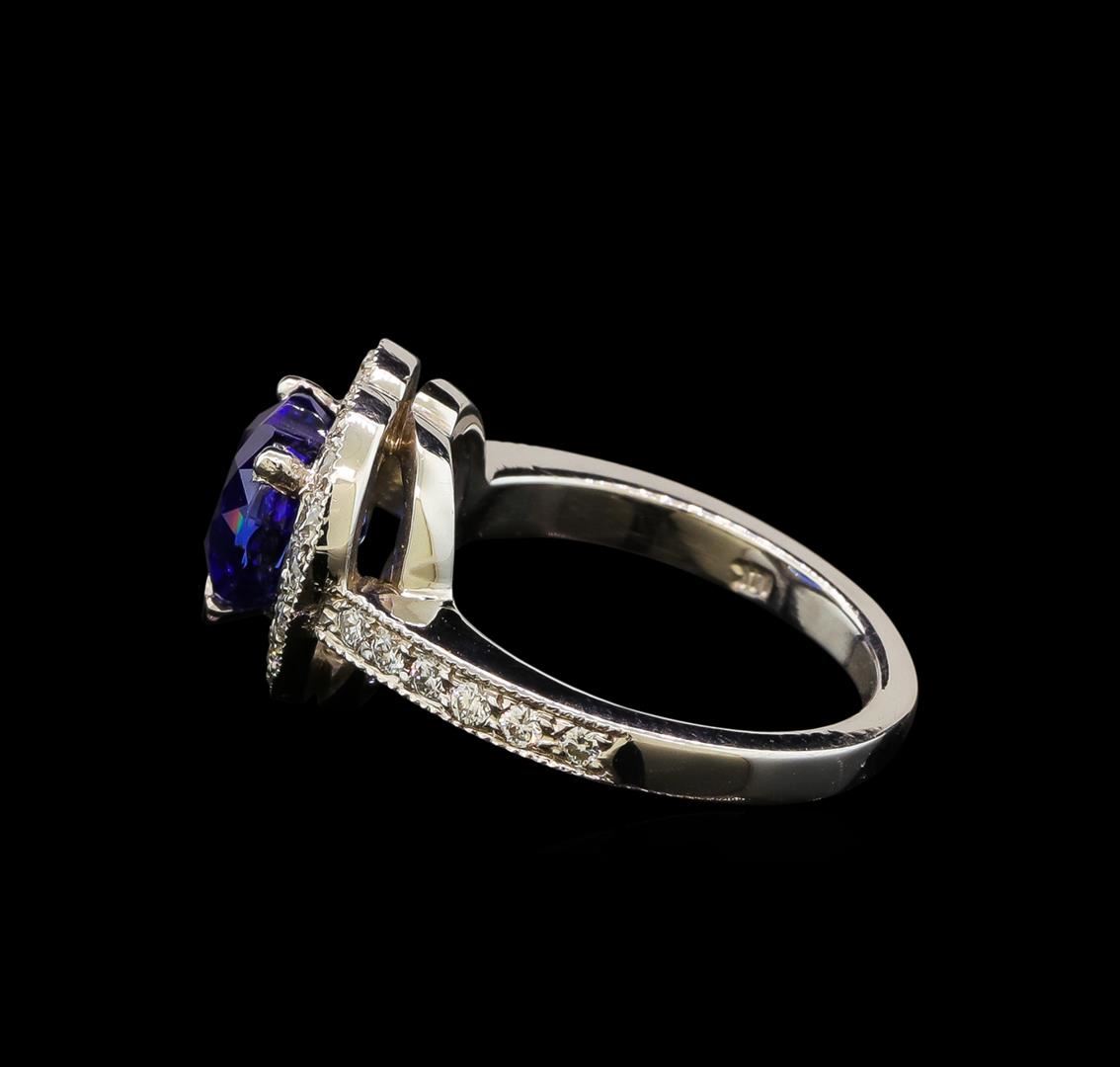 One electronically tested 14KT white gold lady's cast heart shape ring with a halo with a bright polish with milgrain detailing finish. The featured lady's ring has a shank measuring 2.17 millimeters wide. Identified with markings of '14K'. Condition is new, good workmanship. Containing: One prong set heart modified brilliant cut natural blue sapphire, measuring 8.20 x 8.56 x 5.27mm, (depth est.) 5%. bulge factor, approximate weight of 3.03ct., clarity is eye clean, medium dark, strong, blue color, (GIA B 6/5), cut is very good. Transmitting light with no distortion, transparent. Colored gemstones are presumed to have been subjected to commonly used enhancement processes. Graded in the setting. Twenty-Eight prong set round brilliant cut diamonds, measuring 1.85 - 1.75 x 1.10mm (depth est.) approximate total weight of 28 Stones = 0.60ct. Graded in the setting. Clarity SI-1 to SI-2. Color: G - H Cut Good. Total Weight of Colored Stones 3.03ct.. Total Weight of Diamonds 0.60ct.. Total Weight of Ring 6.50gm. GAS Appraised at $31,990.00.
