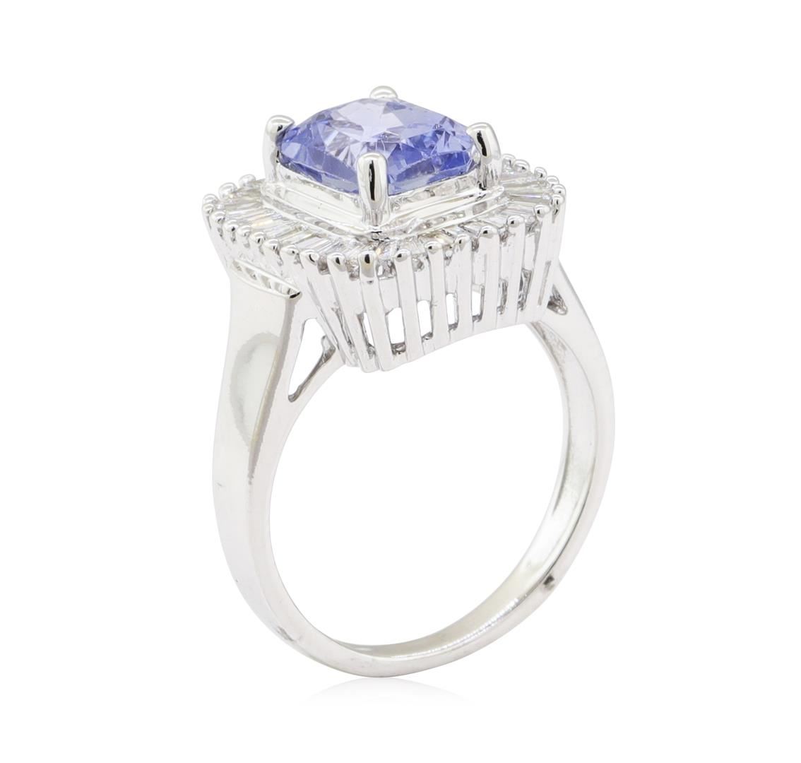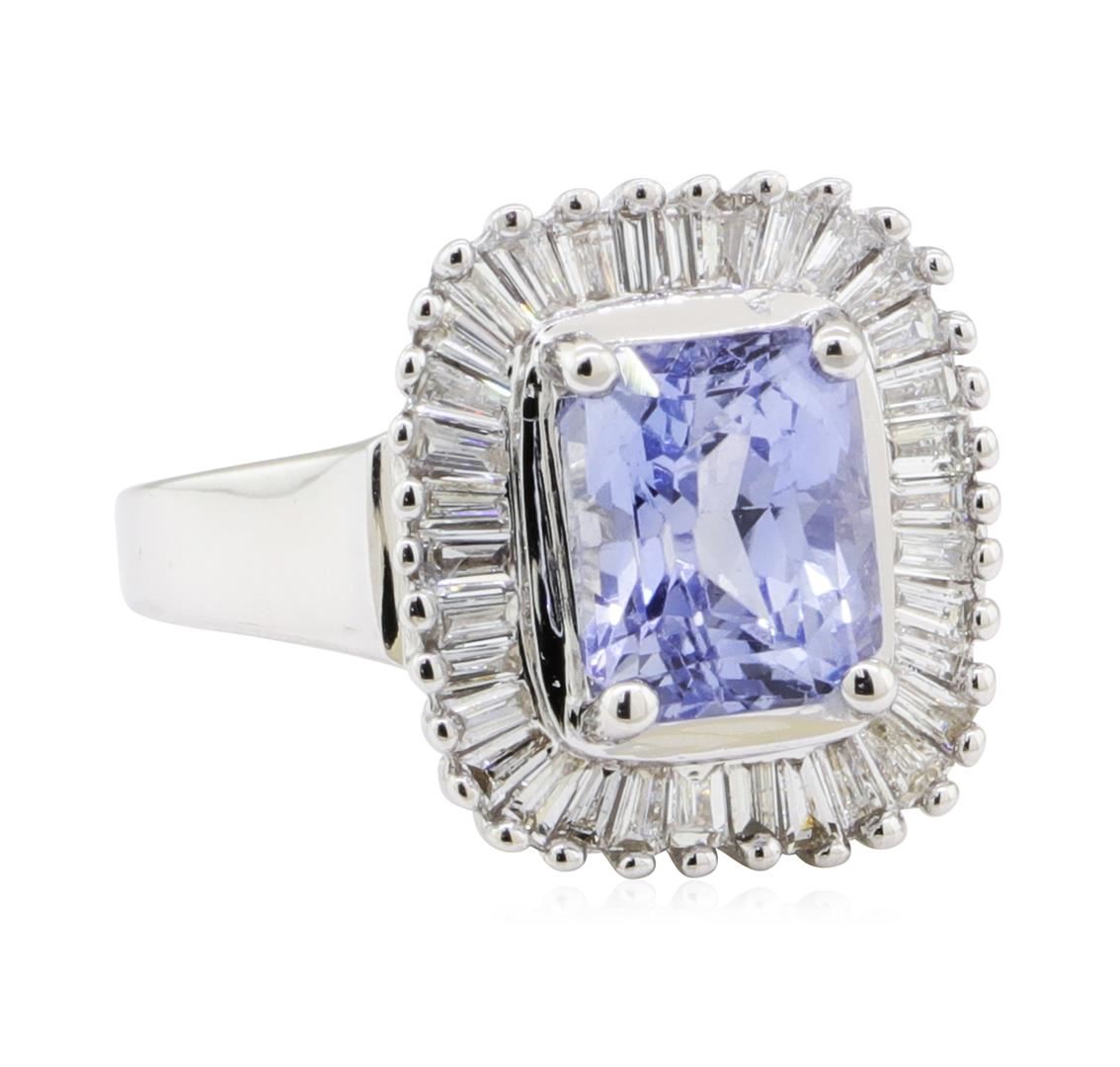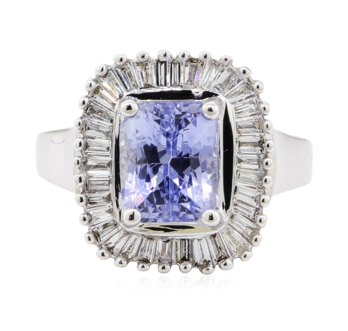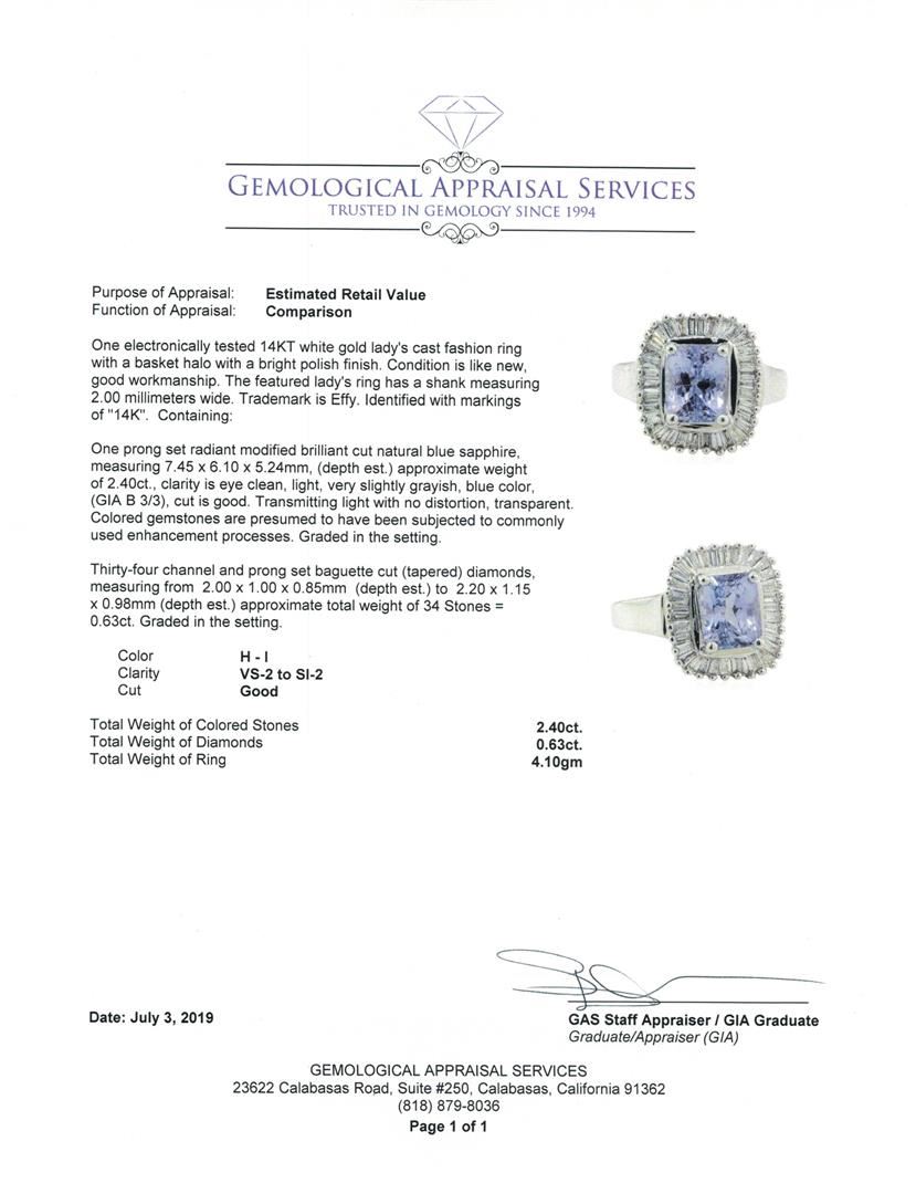 One electronically tested 14KT white gold lady's cast fashion ring with a basket halo with a bright polish finish. The featured lady's ring has a shank measuring 2.00 millimeters wide. Trademark is Effy. Identified with markings of '14K'. Condition is like new, good workmanship. Containing: One prong set radiant modified brilliant cut natural blue sapphire, measuring 7.45 x 6.10 x 5.24mm, (depth est.) approximate weight of 2.40ct., clarity is eye clean, light, very slightly grayish, blue color, (GIA B 3/3), cut is good. Transmitting light with no distortion, transparent. Colored gemstones are presumed to have been subjected to commonly used enhancement processes. Graded in the setting. Thirty-Four channel and prong set baguette cut (tapered) diamonds, measuring from 2.00 x 1.00 x 0.85mm (depth est.) to 2.20 x 1.15 x 0.98mm (depth est.) approximate total weight of 34 Stones = 0.63ct. Graded in the setting. Color H - I Clarity VS-2 to SI-2 Cut Good. Total Weight of Colored Stones 2.40ct.. Total Weight of Diamonds 0.63ct.. Total Weight of Ring 4.10gm GAS Appraised at $4550.00. GAS Appraised at $4,550.00.