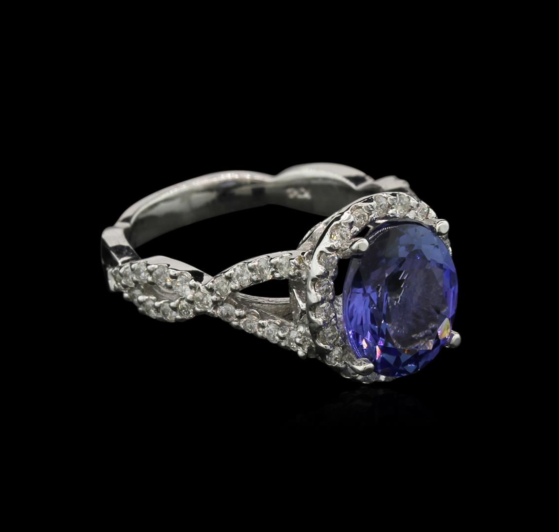 One electronically tested 14KT white gold lady's cast fashion ring with a halo with a bright polish finish. The featured lady's ring has a split crossover shank measuring 2.75 millimeters in width. Identified with markings of "K14". Condition is new, good workmanship. Containing: One prong set oval modified brilliant cut natural tanzanite, measuring 10.20 x 8.38 x 5.14mm, approximate weight of 3.03ct., clarity is eye clean, type I, medium, very slightly grayish, violetish blue color, (GIA vB 5/3), cut is good. Transmitting light with no distortion, transparent. Colored gemstones are presumed to have been subjected to commonly used enhancement processes. Graded in the setting. Fifty-Six prong set round brilliant cut diamonds, measuring 1.40 - 1.30 x 0.84mm (depth est.) approximate total weight of 56 Stones = 0.52ct. Graded in the setting. Clarity: SI-2 to I-1. Color: H - I. Cut Good. Total Weight of Colored Stones 3.03ct. Total Weight of Diamonds 0.52ct. Total Weight of Ring 5.10gm. GAS Appraised at $6,000.00.