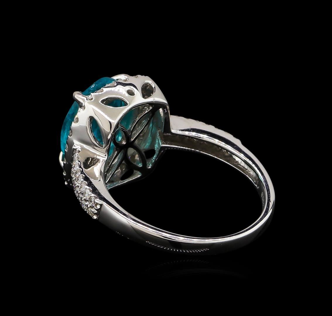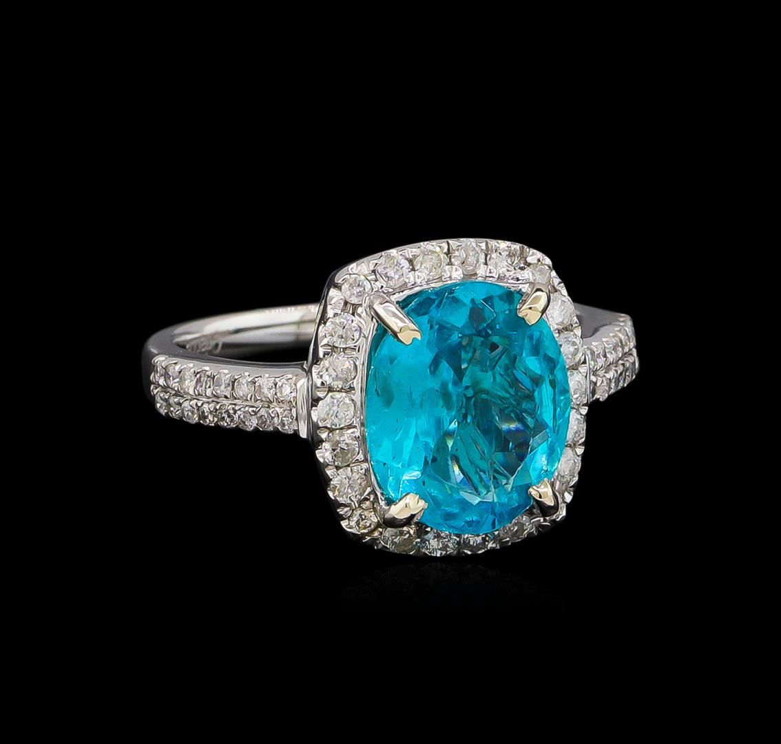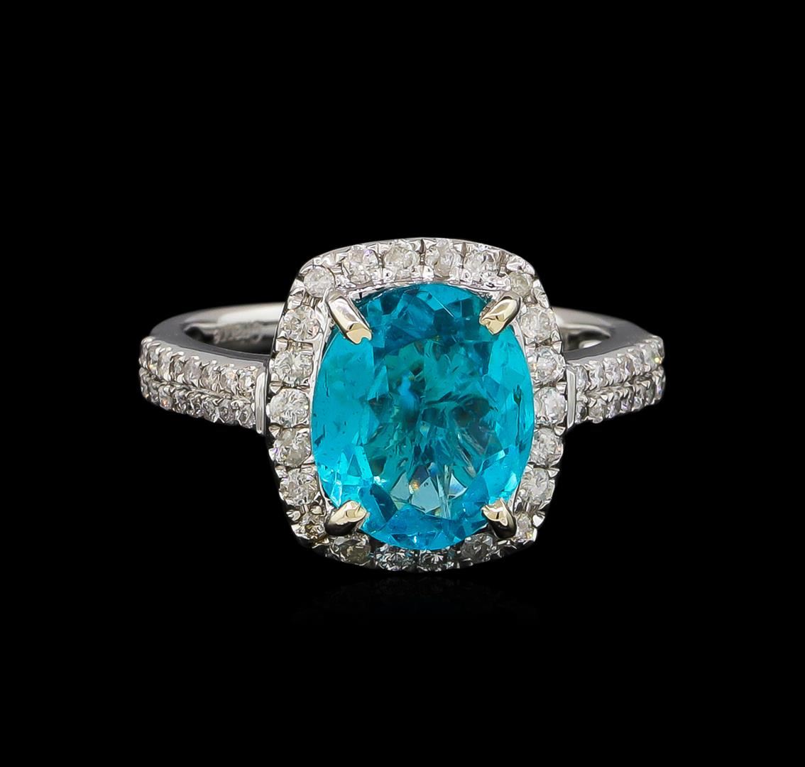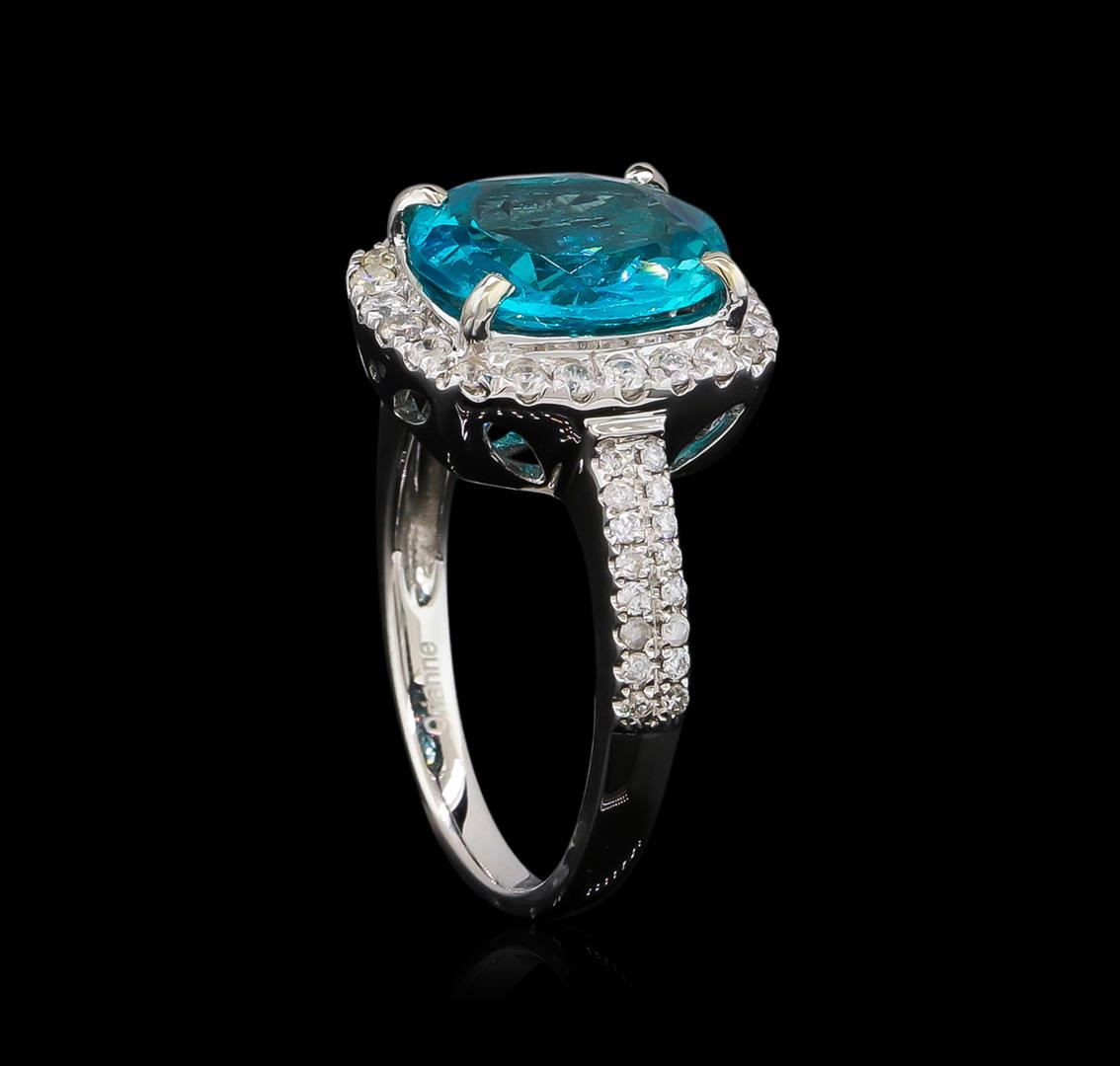 One electronically tested 14KT white gold lady's cast fashion ring with a cathedral halo with a bright polish finish. The featured ladies ring has a shank measuring 2.00 millimeters in width. Trademark is Orianne. Identified with markings of "14K". Condition is new, good workmanship. Containing: One prong set oval modified brilliant cut natural apatite, measuring 10.85 x 9.00 x 4.70mm, approximate weight of 3.04ct., clarity is slightly included, medium dark, moderately strong, very strongly bluish green color, (GIA vstbG 6/4), cut is good. Transmitting light with a minimum of distortion, transparent. Colored gemstones are presumed to have been subjected to commonly used enhancement processes. Graded in the setting. Twenty-Two prong set round brilliant cut diamonds, measuring 1.60 - 1.50 x 0.93mm (depth est.) approximate total weight of 22 Stones = 0.30ct. Graded in the setting. Clarity: SI-2 to I-2. Color: H - I. Cut Good Thirty-Two prong set round brilliant cut diamonds, measuring 1.10 - 1.00 x 0.63mm (depth est.) approximate total weight of 32 Stones = 0.16ct. Graded in the setting. Clarity: I-1 to I-2. Color: H - I. Cut Good. Total Weight of Colored Stones 3.04ct. Total Weight of Diamonds 0.46ct. Total Weight of Ring 5.20gm. GAS Appraised at $3,975.00.