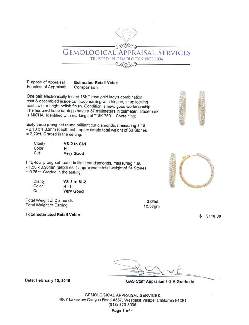 One pair electronically tested 18KT rose gold lady's combination cast & assembled inside out hoop earring with hinged, snap locking posts with a bright polish finish. The featured hoop earrings have a 37 millimeters in diameter. Trademark is MICHA. Identified with markings of "18K 750". Condition is new, good workmanship. Containing: Sixty-Three prong set round brilliant cut diamonds, measuring 2.15 - 2.10 x 1.32mm (depth est.) approximate total weight of 63 Stones = 2.29ct. Graded in the setting. Clarity: VS-2 to SI-1. Color: H - I. Cut Very Good Fifty-Four prong set round brilliant cut diamonds, measuring 1.60 - 1.50 x 0.96mm (depth est.) approximate total weight of 54 Stones = 0.75ct. Graded in the setting. Clarity: VS-2 to SI-2. Color: H - I. Cut Very Good. Total Weight of Diamonds 3.04ct. Total Weight of Earring 12.50gm. GAS Appraised at $9,110.00.