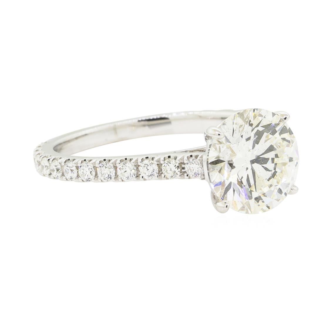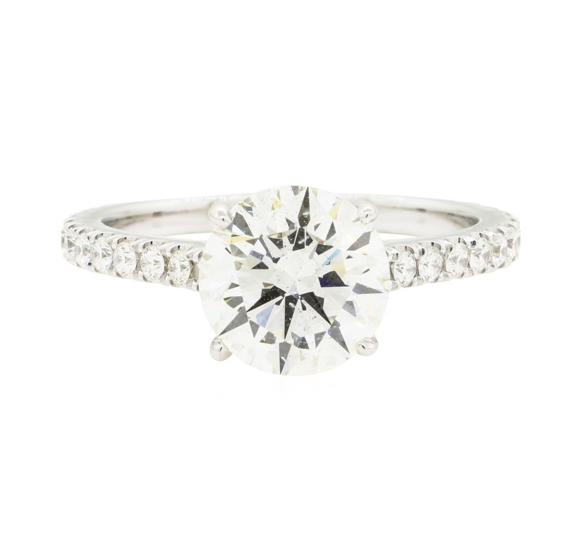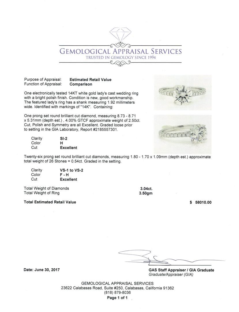 One electronically tested 14KT white gold lady's cast wedding ring with a bright polish finish. The featured lady's ring has a shank measuring 1.92 millimeters wide. Identified with markings of '14K'. Condition is new, good workmanship. Containing: One prong set round brilliant cut diamond, measuring 8.73 - 8.71 x 5.31mm (depth est.) , 4.00.%. GTCF approximate weight of 2.50ct. Cut, Polish and Symmetry are all Excellent. Graded loose prior to setting in the GIA Laboratory, Report #2185557301. Color H Clarity SI-2 Cut Excellent Twenty-Six prong set round brilliant cut diamonds, measuring 1.80 - 1.70 x 1.09mm (depth est.) approximate total weight of 26 Stones = 0.54ct. Graded in the setting. Color F - H Clarity VS-1 to VS-2 Cut Excellent. Total Weight of Diamonds 3.04ct.. Total Weight of Ring 3.50gm GAS Appraised at $58010.00. GAS Appraised at $58,010.00.