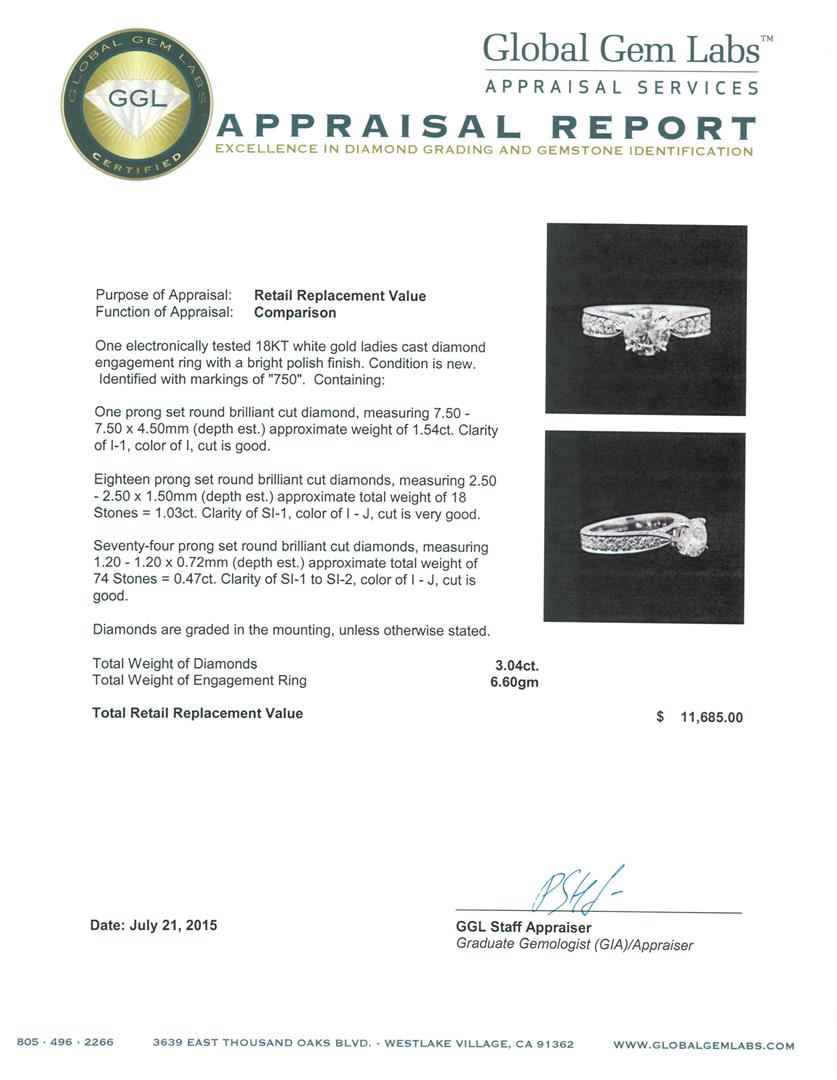 One electronically tested 18KT white gold ladies cast diamond engagement ring with a bright polish finish. Identified with markings of "750". Condition is new. Containing: One prong set round brilliant cut diamond, measuring 7.50 - 7.50 x 4.50mm (depth est.) approximate weight of 1.54ct. Clarity: I-1. Color: I, Cut is Good. Eighteen prong set round brilliant cut diamonds, measuring 2.50 - 2.50 x 1.50mm (depth est.) approximate total weight of 18 Stones = 1.03ct. Clarity: SI-1. Color: I - J, Cut is Very Good. Seventy-Four prong set round brilliant cut diamonds, measuring 1.20 - 1.20 x 0.72mm (depth est.) approximate total weight of 74 Stones = 0.47ct. Clarity: SI-1 to SI-2. Color: I - J, Cut is Good. Diamonds are graded in the mounting, unless otherwise stated. Total Weight of Diamonds 3.04ct. Total Weight of Engagement Ring 6.60gm. GGL Appraised at $11,685.00.