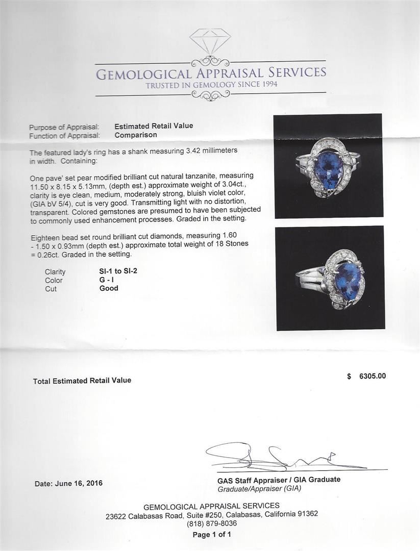 One electronically tested 14KT white gold lady's ring has a shank measuring 3.42 millimeters in width. Containing: One pave' set pear modified brilliant cut natural tanzanite, measuring 11.50 x 8.15 x 5.13mm, (depth est.) approximate weight of 3.04ct., clarity is eye clean, medium, moderately strong, bluish violet color, (GIA bV 5/4), cut is very good. Transmitting light with no distortion, transparent. Colored gemstones are presumed to have ben subjected to commonly used enhancement processes. Graded in the setting. Eighteen bead set round brilliant cut diamonds, measuring 1.60 - 1.50 x 0.93mm (depth est.) approximate total weight of 18 Stones = 0.26ct. Graded in the setting. Clarity: SI-1 to SI-2. Color: G - I. Cut: Good. Total Weight of Colored Stones 3.04ct. Total Weight of Diamonds 0.26ct. Total Weight of Ring 5.60 grams. GAS Appraised at $6,305.00.