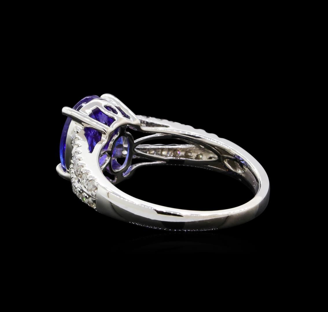 One electronically tested 14KT white gold ladies cast tanzanite and diamond ring with a bright polish finish. The featured tanzanite is supported by diamond set split shoulders, completed by a two millimeter wide band. Trademark is Orianne. Identified with markings of "14K". Condition is new, good workmanship. Containing: One prong set oval mixed cut natural tanzanite approximate weight of 3.04ct., clarity is slightly included, type I, medium dark, very slightly grayish, bluish violet color, (GIA bV 6/3), cut is good. Transmitting light with a minimum of distortion, transparent. Naturally occurring internal & external characteristics are present. Graded in the setting. Tanzanite is a very rare gemstone that is only found in the country of Tanzania. Originally discovered in 1967. Tiffany & Company, named the stone Tanzanite. It is found in the Usumburu Mountains that border the Umba Valley of northern Tanzania. Tanzanite occurs in gray, brown, violet, blue, reddish-purple, & green. The gem is interesting because of its exceptional pleochroism. Rotated in different directions a tanzanite will exhibit multiple changes of color. Tanzanite has a low tolerance to ultrasonic cleaning, and should not be cleaned using this method. Thirty-Two prong set round brilliant cut diamonds approximate total weight of 32 Stones = 0.30ct. Graded in the setting. Clarity: I-2 to I-3. Color: G - I. Total Weight of Colored Stones 3.04ct. Total Weight of Diamonds 0.30ct. Total Weight of Ring 4.11gm. AIG Appraised at $7,705.00.