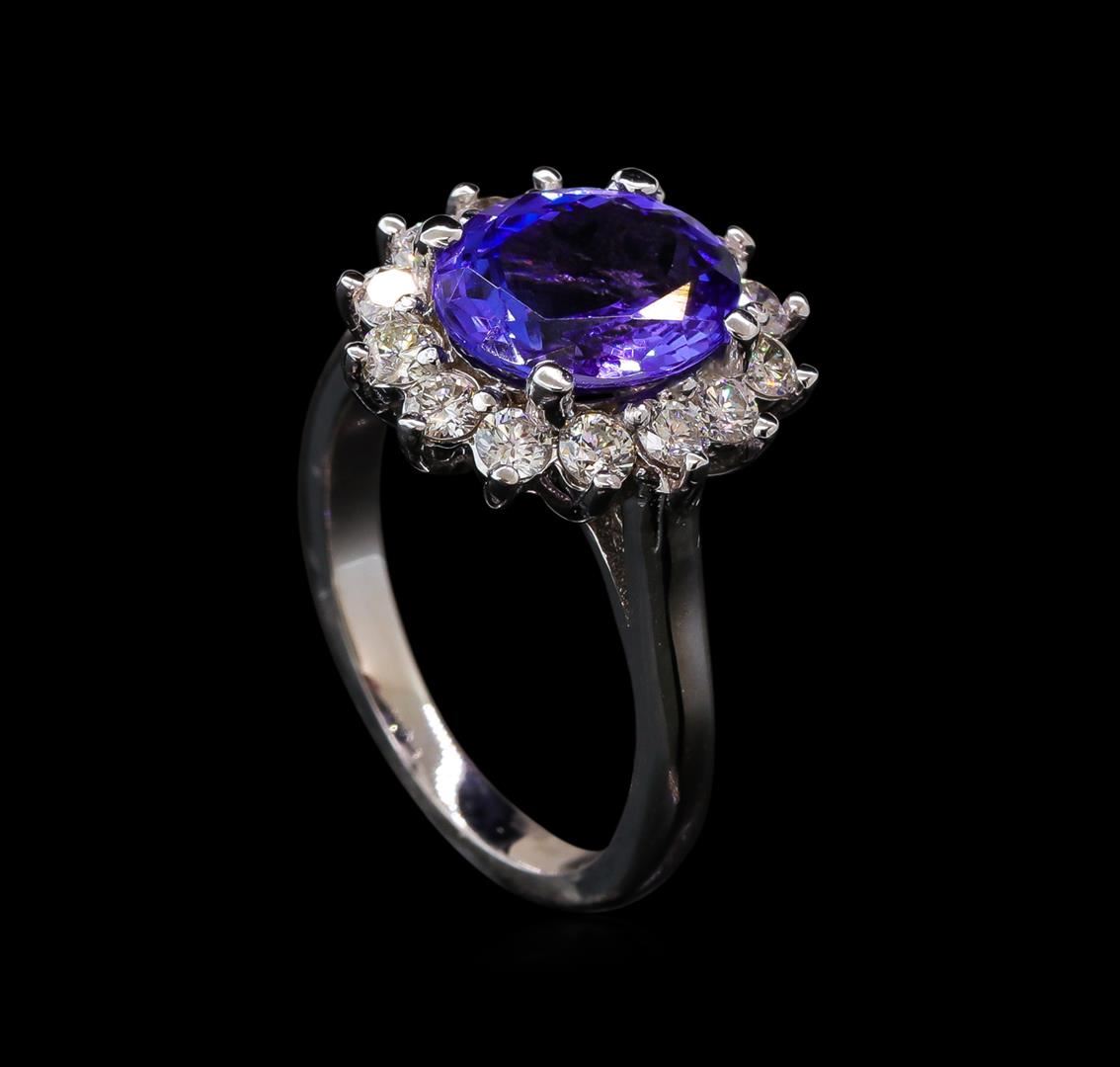 One electronically tested 14KT white gold lady's cast fashion ring with a basket halo with a bright polish finish. The featured lady's ring has a shank measuring 2.15 millimeters wide. Identified with markings of '14K'. Condition is new, good workmanship. Containing: One prong set oval modified brilliant cut natural tanzanite, measuring 10.43 x 8.37 x 4.78mm, (depth est.) 4%. bulge factor, approximate weight of 3.04ct., clarity is eye clean, medium, moderately strong, violetish blue color, (GIA vB 5/4), cut is very good. Transmitting light with no distortion, transparent. Colored gemstones are presumed to have been subjected to commonly used enhancement processes. Graded in the setting. Fourteen prong set round brilliant cut diamonds, measuring 2.50 - 2.40 x 1.49mm (depth est.) approximate total weight of 14 Stones = 0.76ct. Graded in the setting. Clarity SI-1 to SI-2. Color: H - I Cut Good. Total Weight of Colored Stones 3.04ct. Total Weight of Diamonds 0.76ct. Total Weight of Ring 5.70gm. GAS Appraised at $7,470.00.