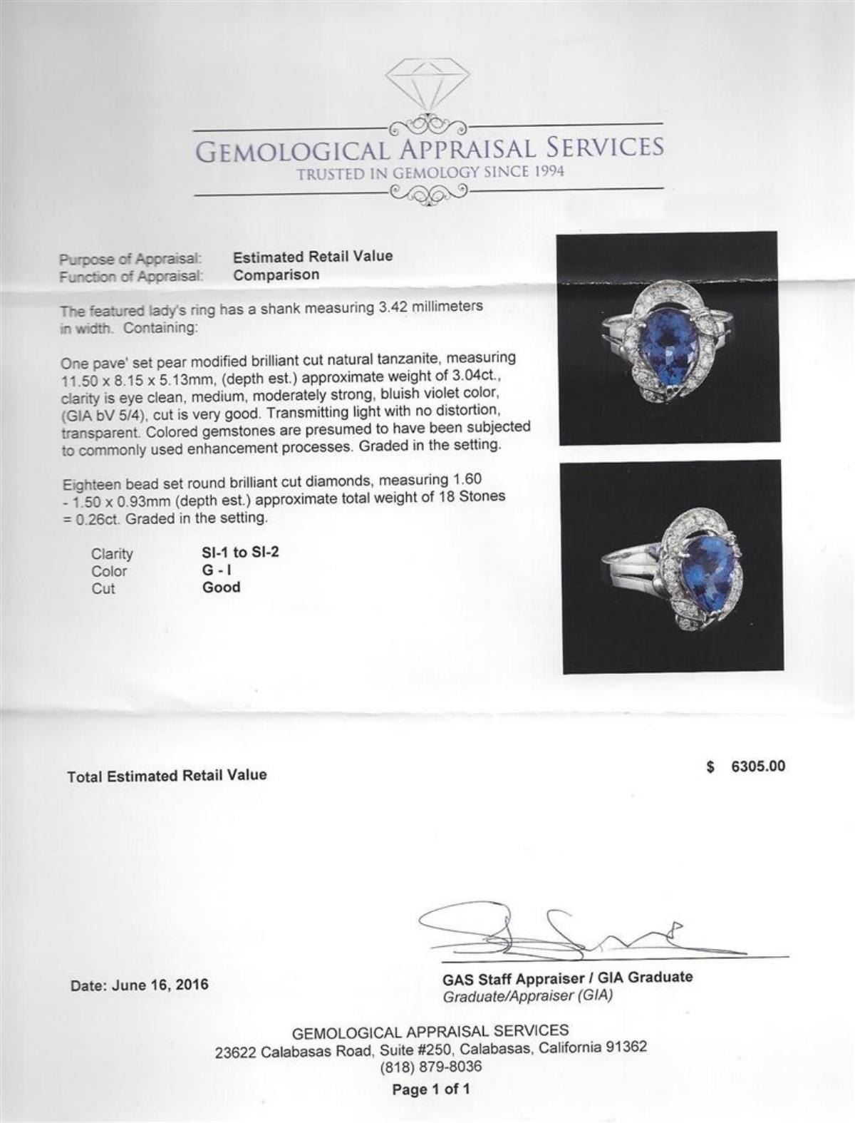 One electronically tested 14KT white gold lady's ring has a shank measuring 3.42 millimeters in width. Containing: One pave' set pear modified brilliant cut natural tanzanite, measuring 11.50 x 8.15 x 5.13mm, (depth est.) approximate weight of 3.04ct., clarity is eye clean, medium, moderately strong, bluish violet color, (GIA bV 5/4), cut is very good. Transmitting light with no distortion, transparent. Colored gemstones are presumed to have ben subjected to commonly used enhancement processes. Graded in the setting. Eighteen bead set round brilliant cut diamonds, measuring 1.60 - 1.50 x 0.93mm (depth est.) approximate total weight of 18 Stones = 0.26ct. Graded in the setting. Clarity: SI-1 to SI-2. Color: G - I. Cut: Good. Total Weight of Colored Stones 3.04ct. Total Weight of Diamonds 0.26ct. Total Weight of Ring 5.60 grams.