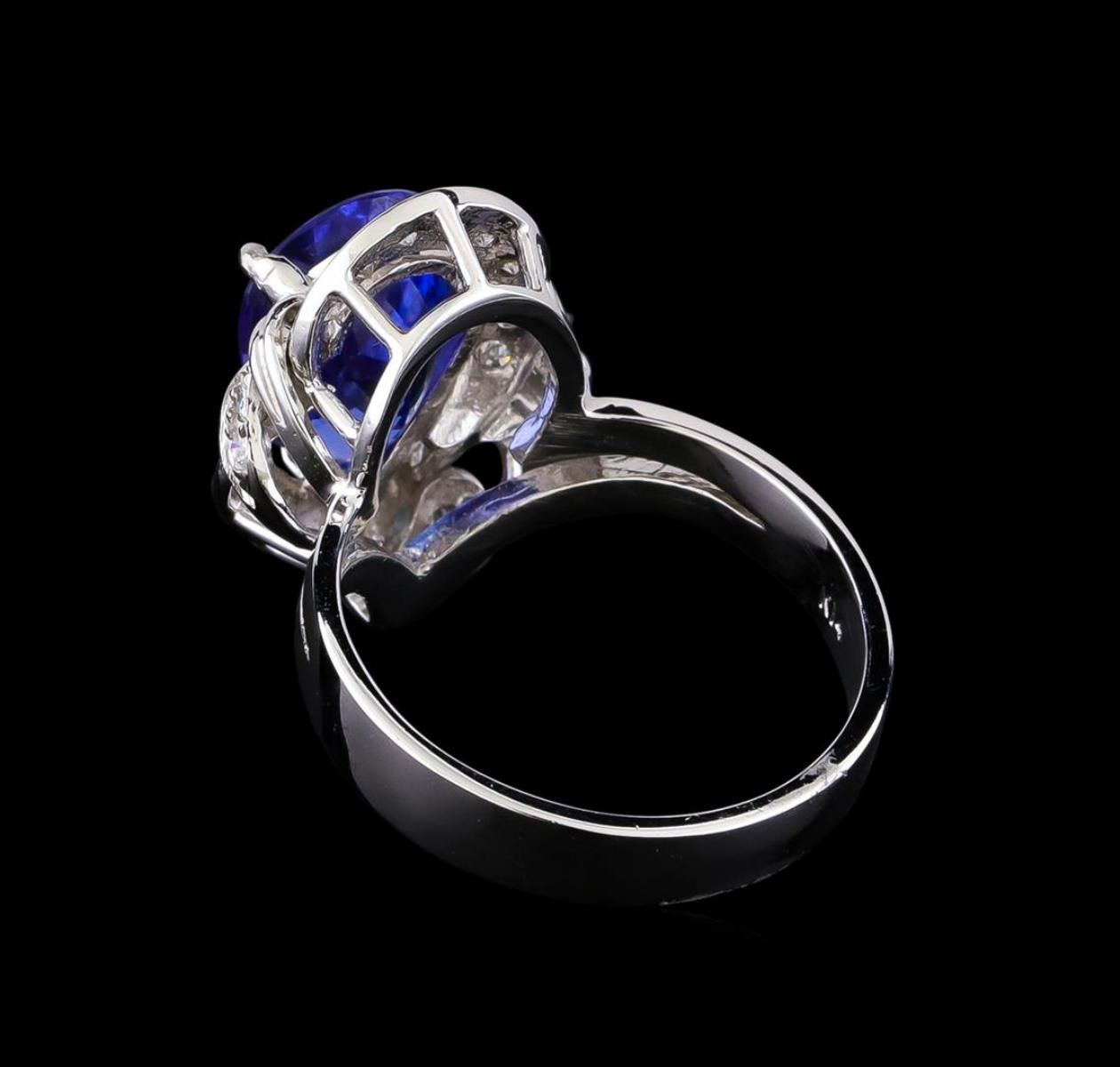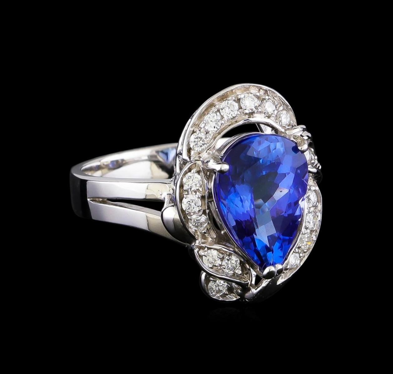One electronically tested 14KT white gold lady's ring has a shank measuring 3.42 millimeters in width. Containing: One pave' set pear modified brilliant cut natural tanzanite, measuring 11.50 x 8.15 x 5.13mm, (depth est.) approximate weight of 3.04ct., clarity is eye clean, medium, moderately strong, bluish violet color, (GIA bV 5/4), cut is very good. Transmitting light with no distortion, transparent. Colored gemstones are presumed to have ben subjected to commonly used enhancement processes. Graded in the setting. Eighteen bead set round brilliant cut diamonds, measuring 1.60 - 1.50 x 0.93mm (depth est.) approximate total weight of 18 Stones = 0.26ct. Graded in the setting. Clarity: SI-1 to SI-2. Color: G - I. Cut: Good. Total Weight of Colored Stones 3.04ct. Total Weight of Diamonds 0.26ct. Total Weight of Ring 5.60 grams.