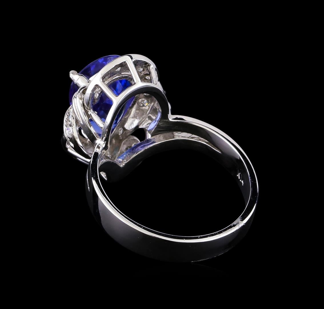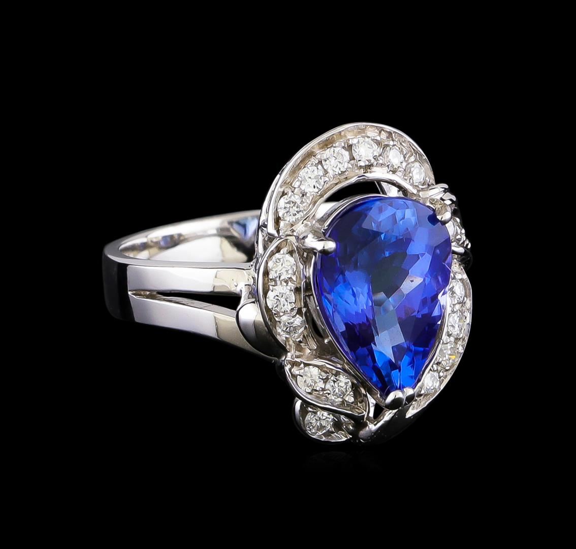 One electronically tested 14KT white gold lady's ring has a shank measuring 3.42 millimeters in width. Containing: One pave' set pear modified brilliant cut natural tanzanite, measuring 11.50 x 8.15 x 5.13mm, (depth est.) approximate weight of 3.04ct., clarity is eye clean, medium, moderately strong, bluish violet color, (GIA bV 5/4), cut is very good. Transmitting light with no distortion, transparent. Colored gemstones are presumed to have ben subjected to commonly used enhancement processes. Graded in the setting. Eighteen bead set round brilliant cut diamonds, measuring 1.60 - 1.50 x 0.93mm (depth est.) approximate total weight of 18 Stones = 0.26ct. Graded in the setting. Clarity: SI-1 to SI-2. Color: G - I. Cut: Good. Total Weight of Colored Stones 3.04ct. Total Weight of Diamonds 0.26ct. Total Weight of Ring 5.60 grams.
