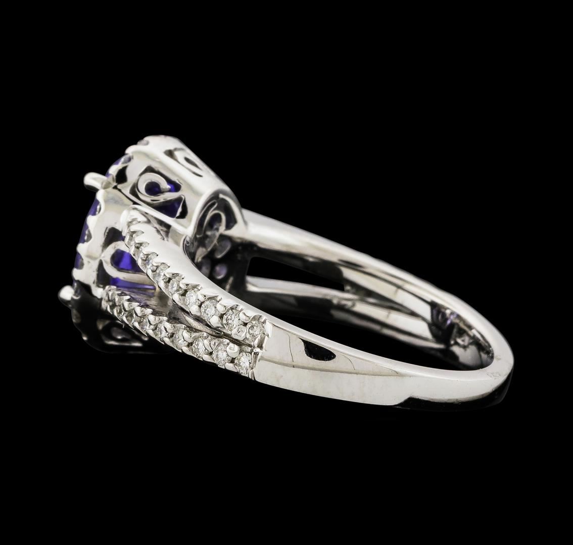 One Tanzanite and Diamond Ring featuring: 14KT White Gold with a total weight of 6.28 grams, Tanzanite with a total weight of 3.04ct, and 62 diamonds with a total weight of 0.52ctw.