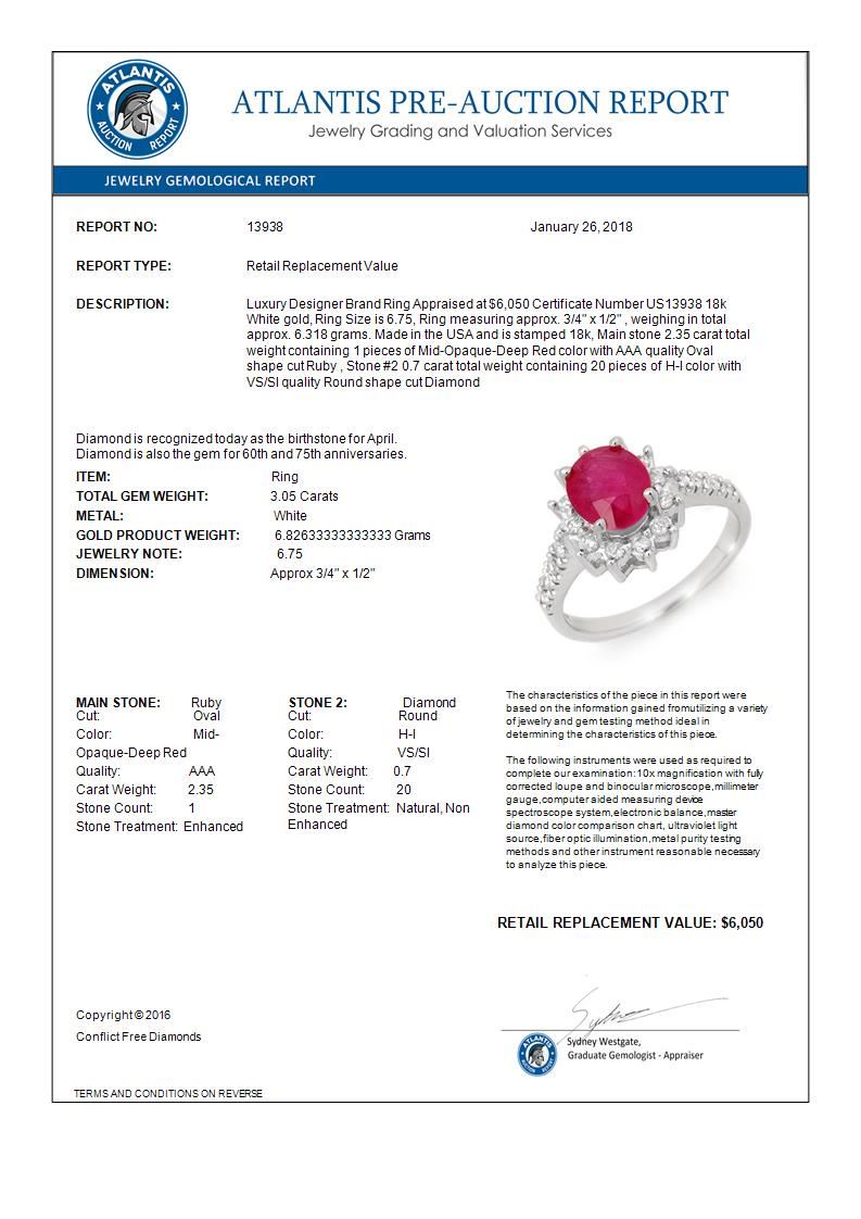 REF-84H4A -13938 ---- 3.05 CTW Ruby & Diamond Ring 18K White Gold ---- Luxury Designer Brand Ring Appraised at $6,050 Certificate Number US13938 18k White gold, Ring Size is 6.75, Ring measuring approx. 3/4" x 1/2" , weighing in total approx. 6.318 grams. Made in the USA and is stamped 18k, Main stone 2.35 carat total weight containing 1 pieces of Mid-Opaque-Deep Red color with AAA quality Oval shape cut Ruby , Stone #2 0.7 carat total weight containing 20 pieces of H-I color with VS/SI quality Round shape cut Diamond
