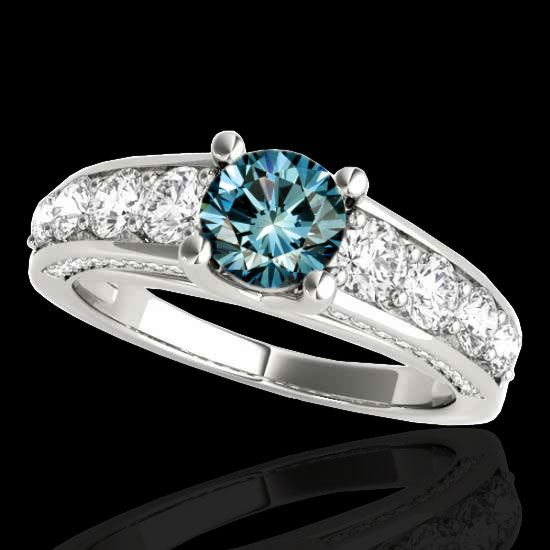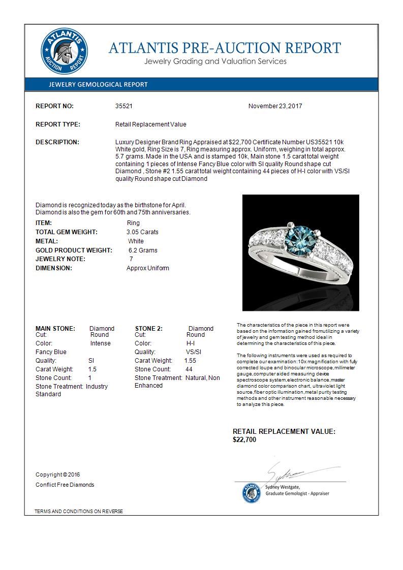 REF-343K6W -35521 ---- 3.05 CTW Si Certified Fancy Blue Diamond Solitaire Ring 10K White Gold ---- Luxury Designer Brand Ring Appraised at $22,700 Certificate Number US35521 10k White gold, Ring Size is 7, Ring measuring approx. Uniform, weighing in total approx. 5.7 grams. Made in the USA and is stamped 10k, Main stone 1.5 carat total weight containing 1 pieces of Intense Fancy Blue color with SI quality Round shape cut Diamond , Stone #2 1.55 carat total weight containing 44 pieces of H-I color with VS/SI quality Round shape cut Diamond