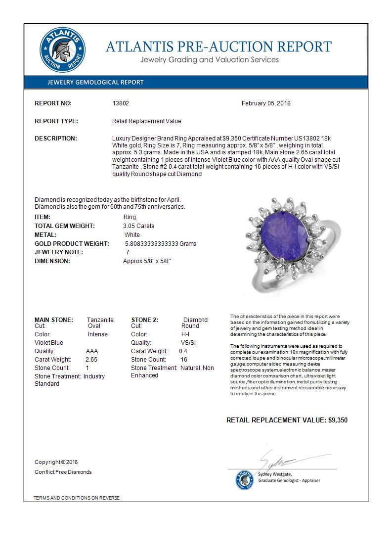 REF-121H6A -13802 ---- 3.05 CTW Tanzanite & Diamond Ring 18K White Gold ---- Luxury Designer Brand Ring Appraised at $9,350 Certificate Number US13802 18k White gold, Ring Size is 7, Ring measuring approx. 5/8" x 5/8" , weighing in total approx. 5.3 grams. Made in the USA and is stamped 18k, Main stone 2.65 carat total weight containing 1 pieces of Intense Violet Blue color with AAA quality Oval shape cut Tanzanite , Stone #2 0.4 carat total weight containing 16 pieces of H-I color with VS/SI quality Round shape cut Diamond