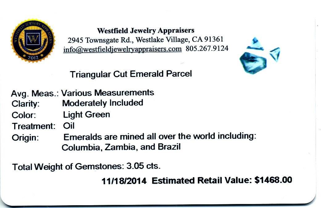 3.05cts. Triangular Cut Emerald Parcel Westfield Appraised at $1,468.00.