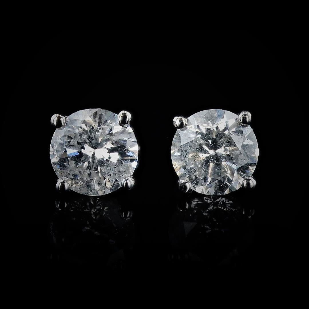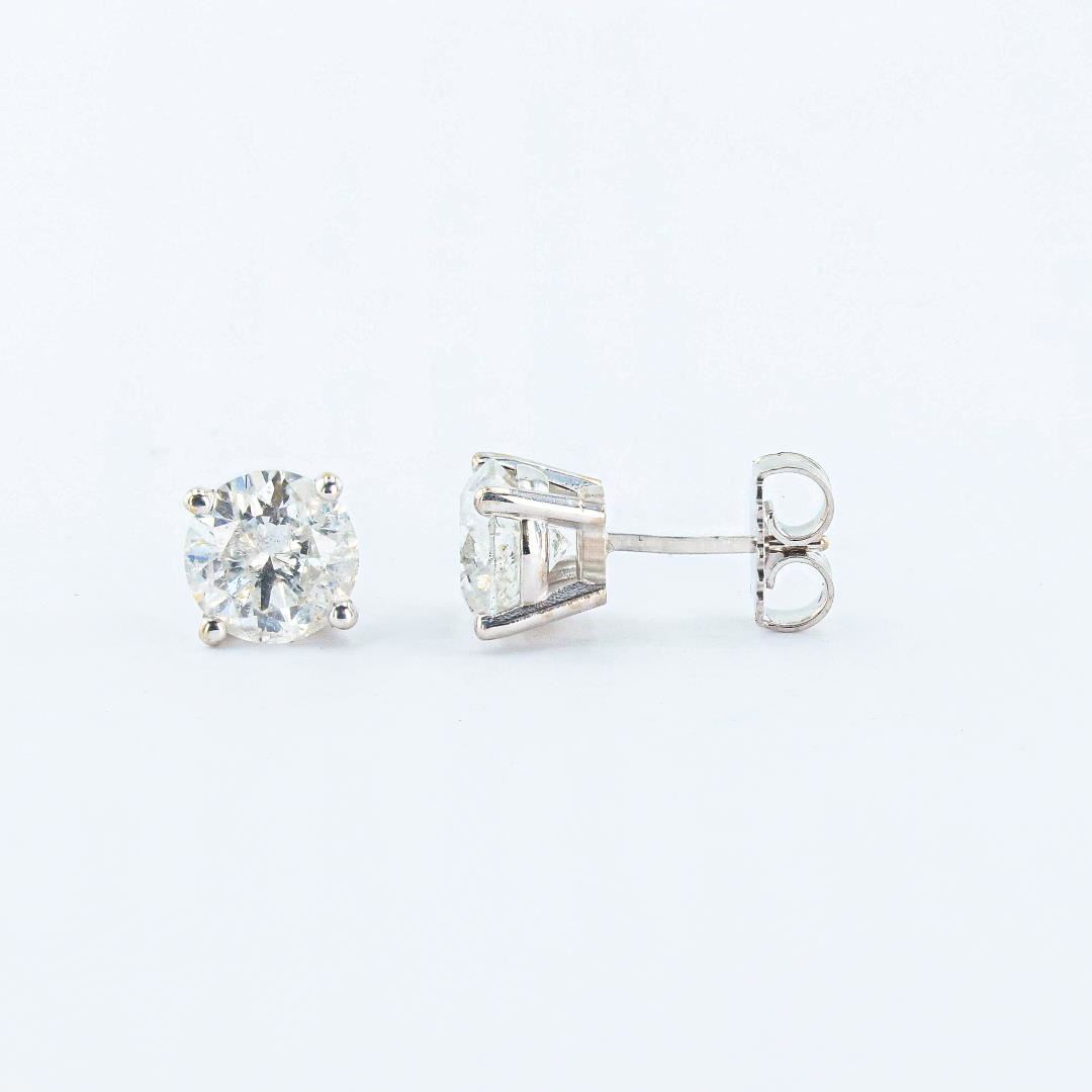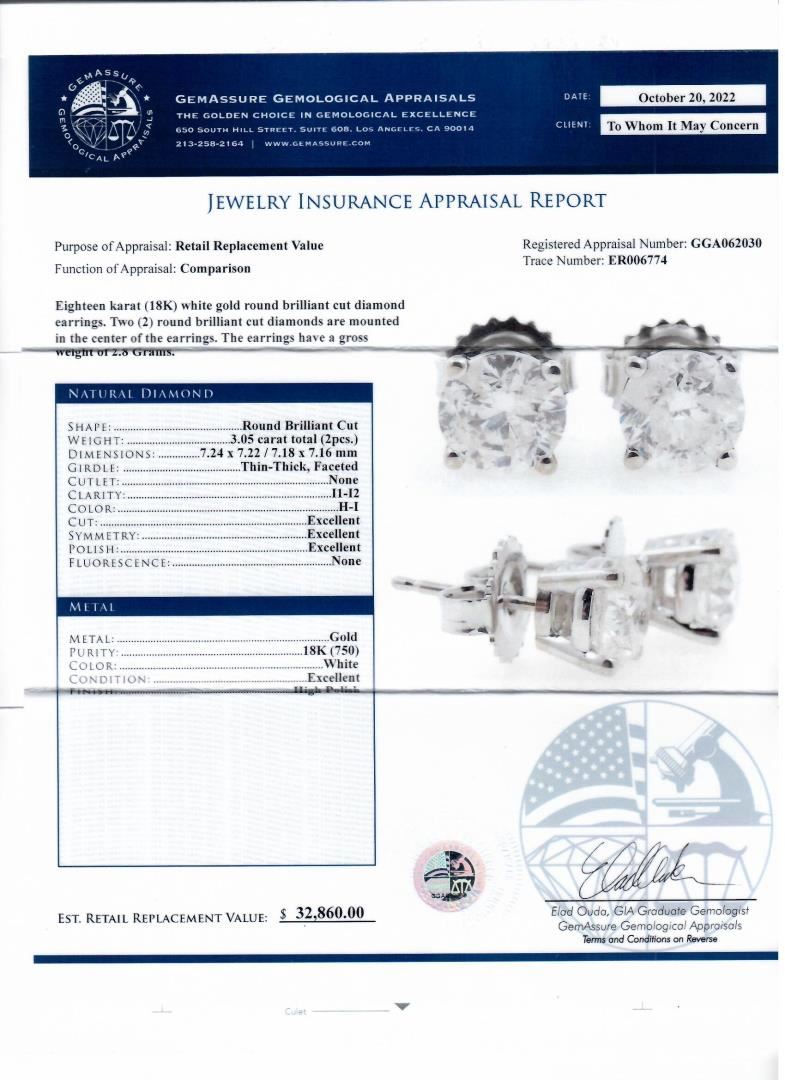 Eighteen karat (18K) white gold round brilliant cut diamond earrings. Two (2) round brilliant cut diamonds are mounted in the center of the earrings. The earrings have a gross weight of 2.8 Grams. #NATURAL DIAMOND# SHAPE: Round Brilliant Cut WEIGHT: 3.05 carat total (2pcs.) DIMENSIONS: 7.24 x 7.22 / 7.18 x 7.16mm GIRDLE: Thin-Thick, Faceted CUTLET: None CLARITY: I1-I2 COLOR: H-I CUT: Excellent SYMMETRY: Excellent POLISH: Excellent FLUORESCENCE: None #METAL# METAL: Gold PURITY: 18K (750) COLOR: White CONDITION: Excellent FINISH: High Polish
