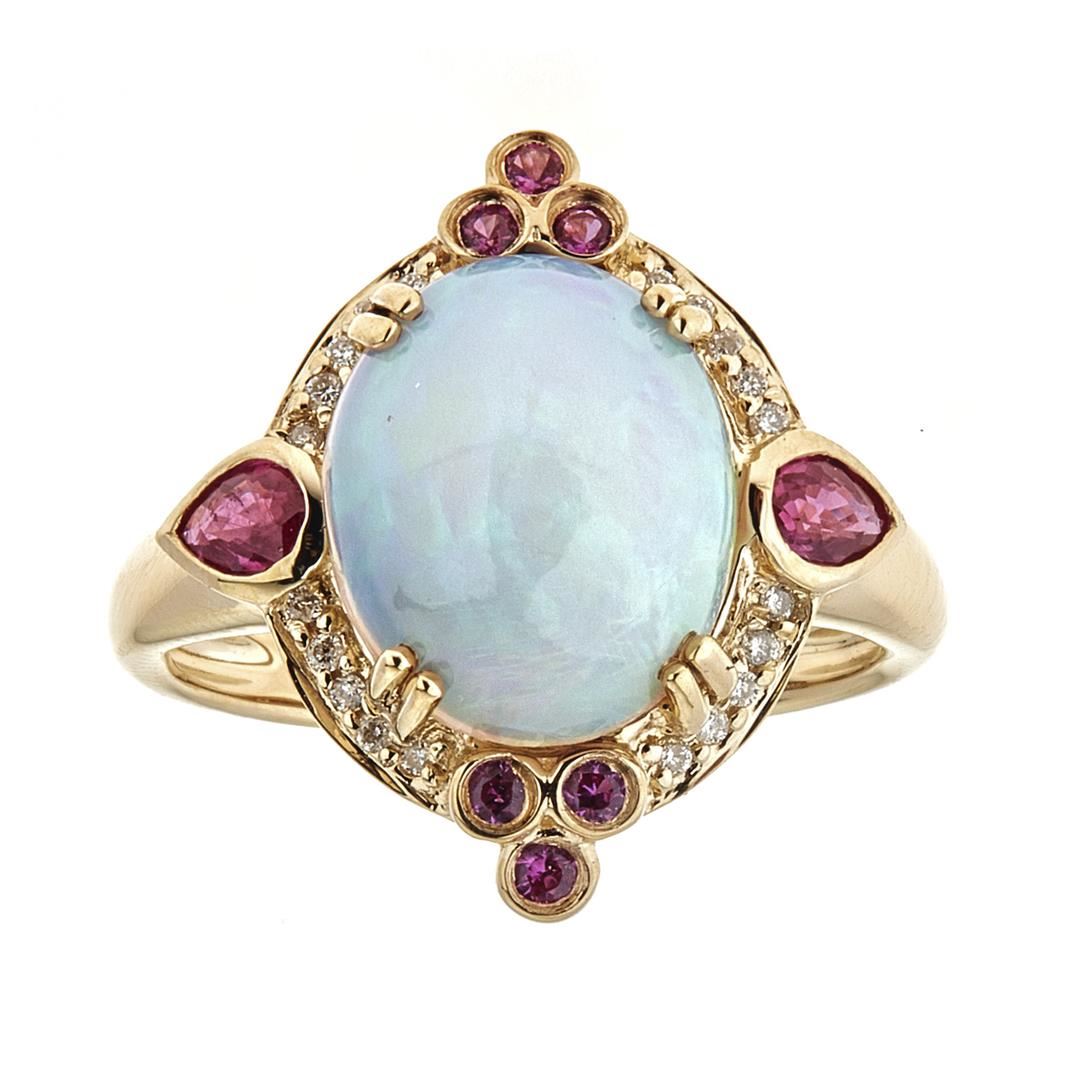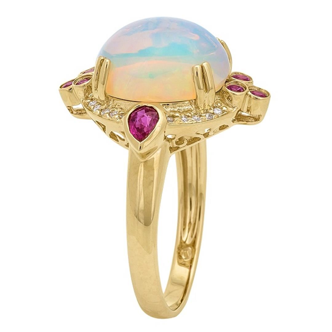 One Ethiopian Opal, Ruby and Diamond Ring featuring: 14KT Yellow Gold with a total weight of 4.32 grams, Ethiopian Opal with a total weight of 3.05ct, eight Rubies with a total weight of 0.53ct, and 20 Diamonds with a total weight of 0.07ct.
