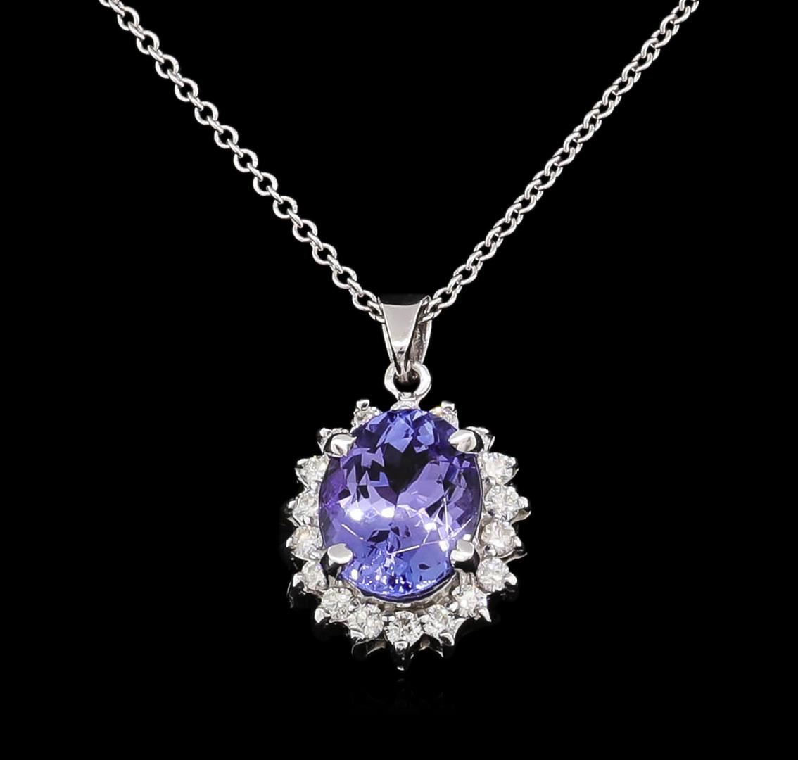 One electronically tested 14KT white gold lady's combination cast & assembled fashion pendant & chain 18.0' long, 1.3mm round cable link with a lobster claw clasp with a bright polish finish. The featured lady's pendant and chain has a drop measuring 20 millimeters in length. Identified with markings of '14K'. Condition is new, good workmanship. Containing: Eighteen prong set round brilliant cut diamonds, measuring 1.85 - 1.75 x 1.12mm (depth est.) approximate total weight of 18 Stones = 0.40ct. Graded in the setting. Clarity SI-1 to SI-2. Color: G - H Cut Good One prong set oval modified brilliant cut natural tanzanite, measuring 10.35 x 8.36 x 5.22mm, (depth est.) approximate weight of 3.05ct., clarity is eye clean, medium light, very slightly grayish, bluish violet color, (GIA bV 4/3), cut is good. Transmitting light with no distortion, transparent. Colored gemstones are presumed to have been subjected to commonly used enhancement processes. Graded in the setting. Total Weight of Colored Stones 3.05ct.. Total Weight of Diamonds 0.40ct.. Total Weight of Pendant & Chain 5.20gm. GAS Appraised at $4,905.00.