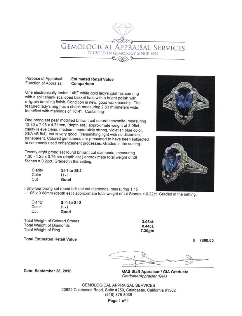 One electronically tested 14KT white gold lady's cast fashion ring with a split shank scalloped basket halo with a bright polish with milgrain detailing finish. The featured lady's ring has a shank measuring 2.63 millimeters wide. Identified with markings of 'K14'. Condition is new, good workmanship. Containing: One prong set pear modified brilliant cut natural tanzanite, measuring 13.30 x 7.05 x 4.71mm, (depth est.) approximate weight of 3.05ct., clarity is eye clean, medium, moderately strong, violetish blue color, (GIA vB 5/4), cut is very good. Transmitting light with no distortion, transparent. Colored gemstones are presumed to have been subjected to commonly used enhancement processes. Graded in the setting. Twenty-Eight prong set round brilliant cut diamonds, measuring 1.30 - 1.25 x 0.79mm (depth est.) approximate total weight of 28 Stones = 0.22ct. Graded in the setting. Clarity SI-1 to SI-2. Color: H - I Cut Good Forty-Four prong set round brilliant cut diamonds, measuring 1.15 - 1.05 x 0.68mm (depth est.) approximate total weight of 44 Stones = 0.22ct. Graded in the setting. Clarity SI-1 to SI-2. Color: H - I Cut Good. Total Weight of Colored Stones 3.05ct.. Total Weight of Diamonds 0.44ct.. Total Weight of Ring 7.30gm. GAS Appraised at $7,660.00.