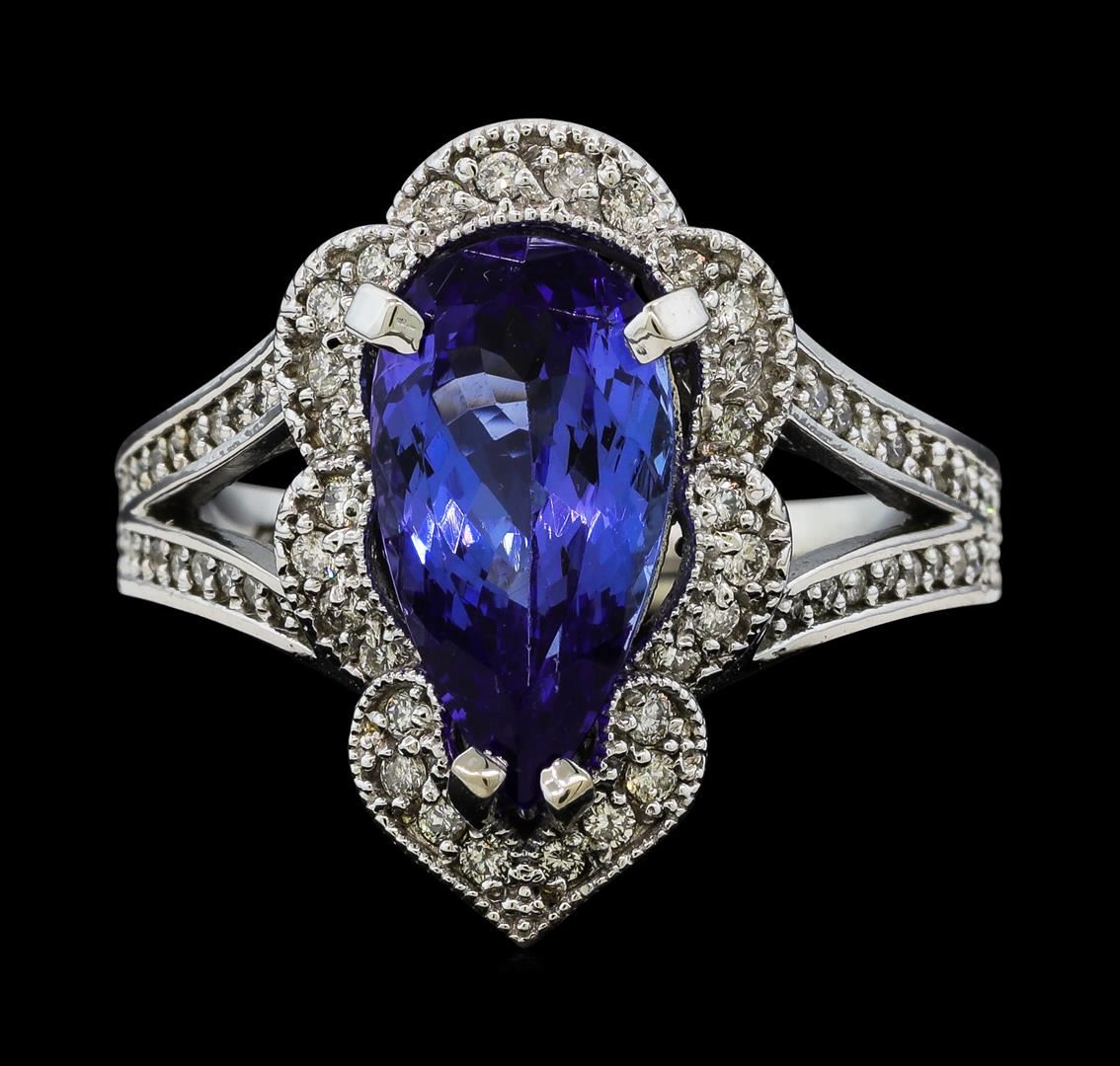 One electronically tested 14KT white gold lady's cast fashion ring with a split shank scalloped basket halo with a bright polish with milgrain detailing finish. The featured lady's ring has a shank measuring 2.63 millimeters wide. Identified with markings of 'K14'. Condition is new, good workmanship. Containing: One prong set pear modified brilliant cut natural tanzanite, measuring 13.30 x 7.05 x 4.71mm, (depth est.) approximate weight of 3.05ct., clarity is eye clean, medium, moderately strong, violetish blue color, (GIA vB 5/4), cut is very good. Transmitting light with no distortion, transparent. Colored gemstones are presumed to have been subjected to commonly used enhancement processes. Graded in the setting. Twenty-Eight prong set round brilliant cut diamonds, measuring 1.30 - 1.25 x 0.79mm (depth est.) approximate total weight of 28 Stones = 0.22ct. Graded in the setting. Clarity SI-1 to SI-2. Color: H - I Cut Good Forty-Four prong set round brilliant cut diamonds, measuring 1.15 - 1.05 x 0.68mm (depth est.) approximate total weight of 44 Stones = 0.22ct. Graded in the setting. Clarity SI-1 to SI-2. Color: H - I Cut Good. Total Weight of Colored Stones 3.05ct.. Total Weight of Diamonds 0.44ct.. Total Weight of Ring 7.30gm. GAS Appraised at $7,660.00.