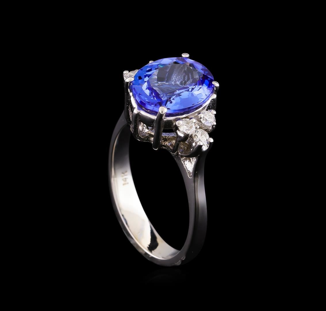 One electronically tested 14KT white gold lady's cast fashion ring with a basket setting with a bright polish finish. The featured lady's ring has a shank measuring 3.36 millimeters wide. Identified with markings of "14K". Condition is new, good workmanship. Containing: One prong set oval modified brilliant cut natural tanzanite, measuring 10.45 x 8.46 x 4.61mm, 7%. bulge factor, approximate weight of 3.05ct., clarity is eye clean, medium, very slightly grayish, violetish blue color, (GIA vB 5/3), cut is very good. Transmitting light with no distortion, transparent. Colored gemstones are presumed to have been subjected to commonly used enhancement processes. Graded in the setting. Six prong set round brilliant cut diamonds, measuring 2.30 - 2.20 x 1.35mm (depth est.) approximate total weight of 6 Stones = 0.25ct. Graded in the setting. Clarity: SI-1 to SI-2. Color: H - I. Cut Good. Total Weight of Colored Stones 3.05ct. Total Weight of Diamonds 0.25ct. Total Weight of Ring 4.80gm. GAS Appraised at $6,045.00.