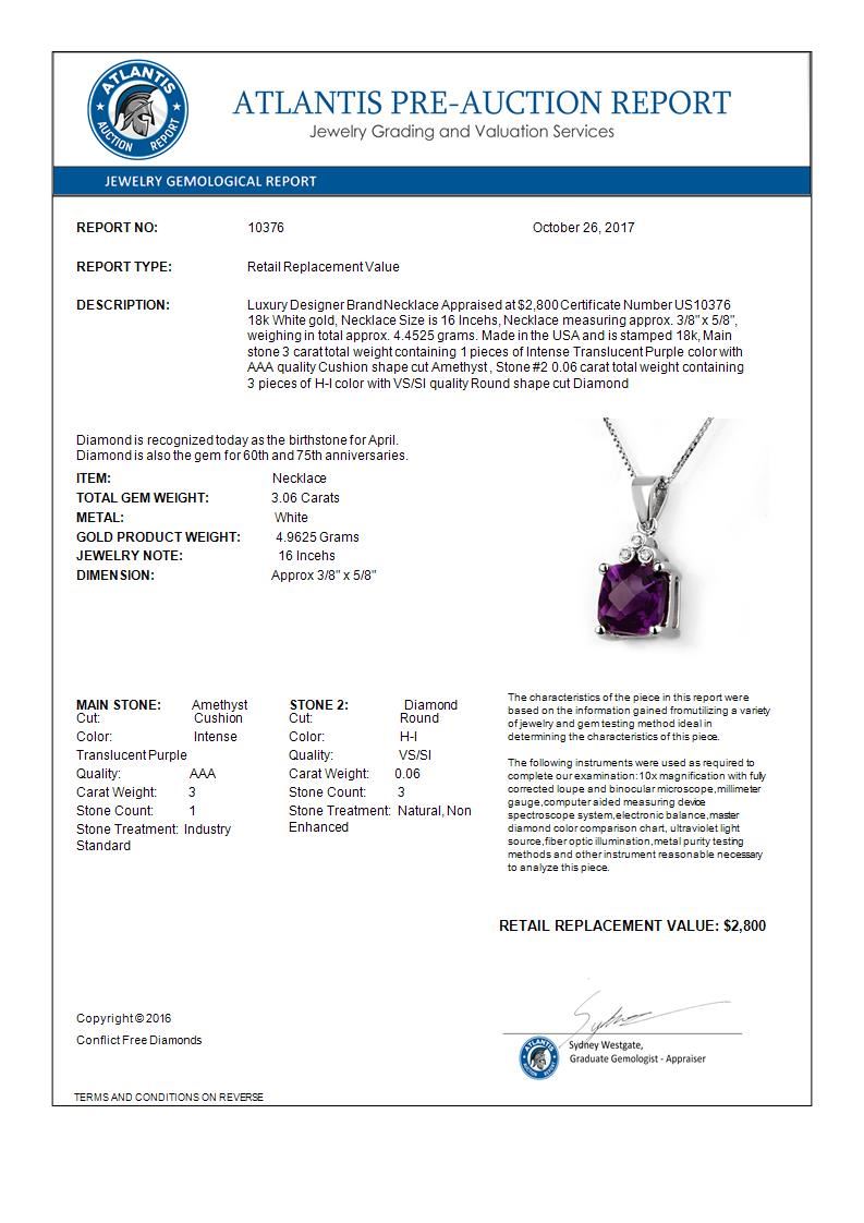 REF-42A8X -10376 ---- 3.06 CTW Amethyst & Diamond Necklace 18K White Gold ---- Luxury Designer Brand Necklace Appraised at $2,800 Certificate Number US10376 18k White gold, Necklace Size is 16 Incehs, Necklace measuring approx. 3/8" x 5/8", weighing in total approx. 4.4525 grams. Made in the USA and is stamped 18k, Main stone 3 carat total weight containing 1 pieces of Intense Translucent Purple color with AAA quality Cushion shape cut Amethyst , Stone #2 0.06 carat total weight containing 3 pieces of H-I color with VS/SI quality Round shape cut Diamond