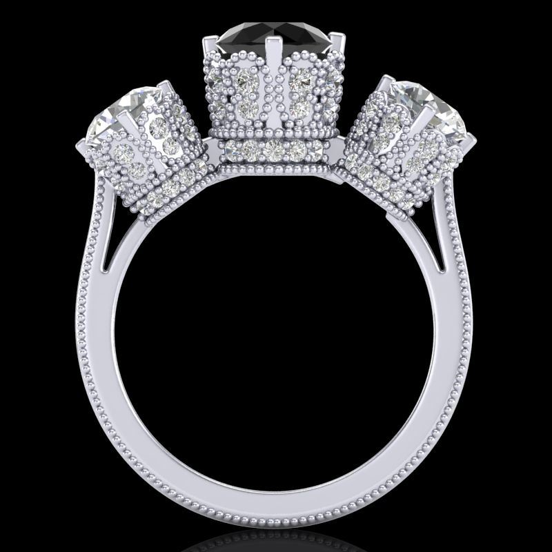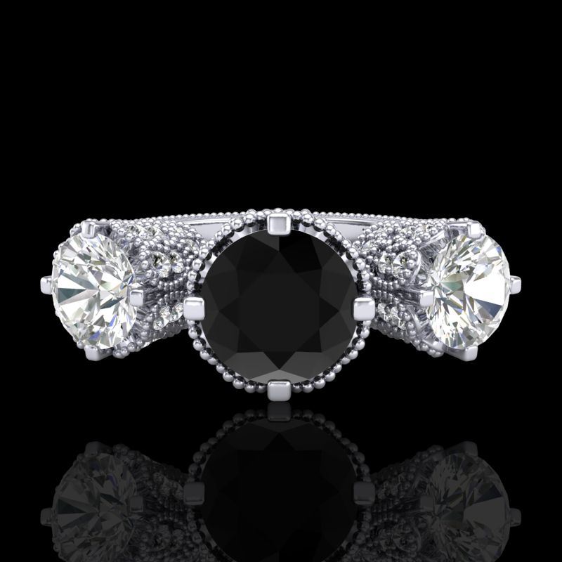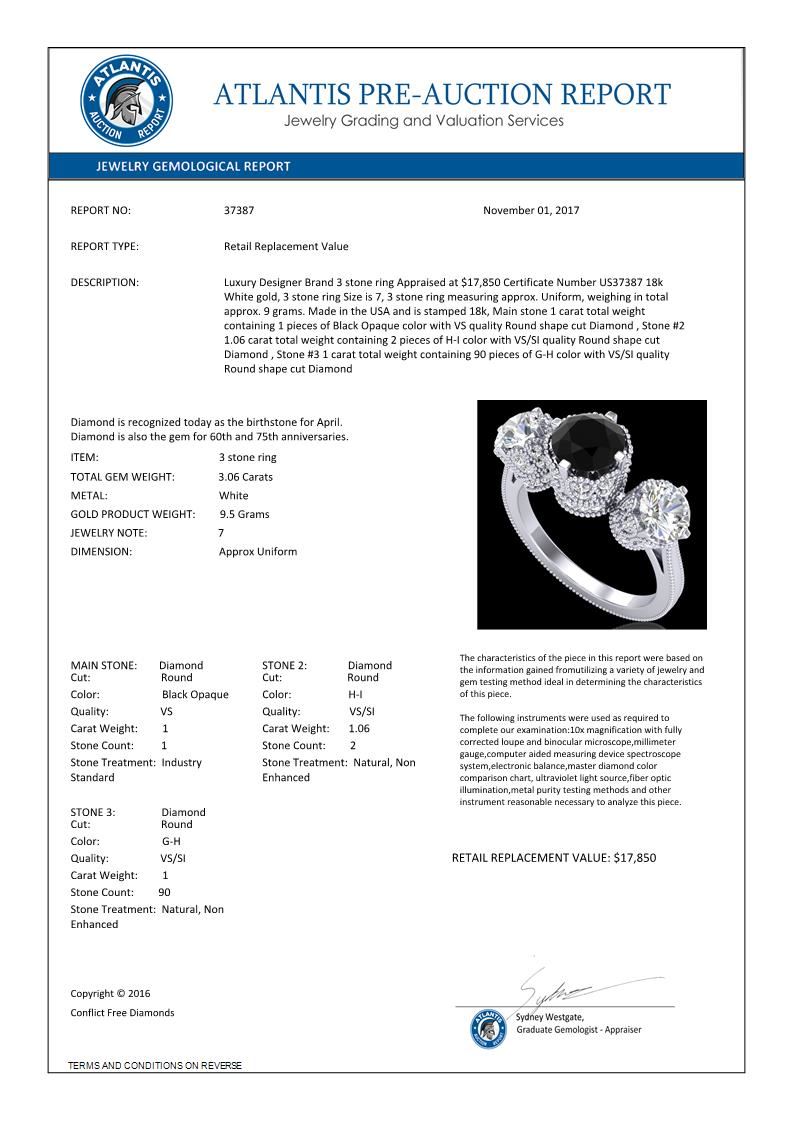 REF-294W9F -37387 ---- 3.06 CTW Fancy Black Diamond Solitaire Art Deco 3 Stone Ring 18K White Gold ---- Luxury Designer Brand 3 stone ring Appraised at $17,850 Certificate Number US37387 18k White gold, 3 stone ring Size is 7, 3 stone ring measuring approx. Uniform, weighing in total approx. 9 grams. Made in the USA and is stamped 18k, Main stone 1 carat total weight containing 1 pieces of Black Opaque color with VS quality Round shape cut Diamond , Stone #2 1.06 carat total weight containing 2 pieces of H-I color with VS/SI quality Round shape cut Diamond , Stone #3 1 carat total weight containing 90 pieces of G-H color with VS/SI quality Round shape cut Diamond
