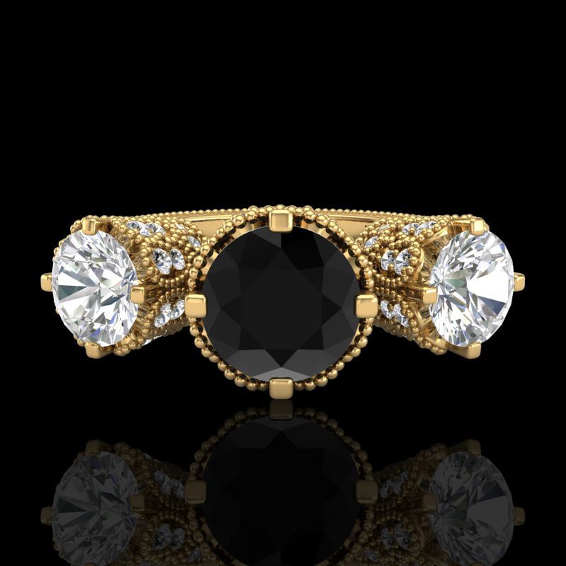 3.06 CTW Fancy Black Diamond Solitaire Art Deco 3 Stone Ring 18K Yellow Gold ---- Luxury Designer Brand 3 stone ring Appraised Retail Price at $17,850 ---- SKU Number US37389 18k Yellow gold 3 stone ring Size is 7, 3 stone ring measuring approx. Uniform, weighing in total approx. 9 grams. Made in the USA and is stamped 18k, Main stone 1.00 carat total weight containing 1 pieces of Black Opaque color with VS quality Round shape cut Diamond , Stone #2 1.06 carat total weight containing 2 pieces of H-I color with VS/SI quality Round shape cut